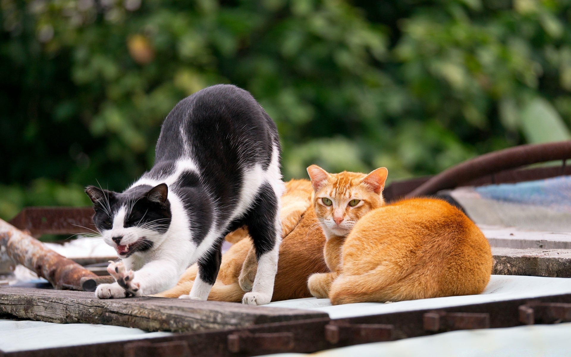 Gatos lindos viven en el pueblo de vacaciones con sus amigos