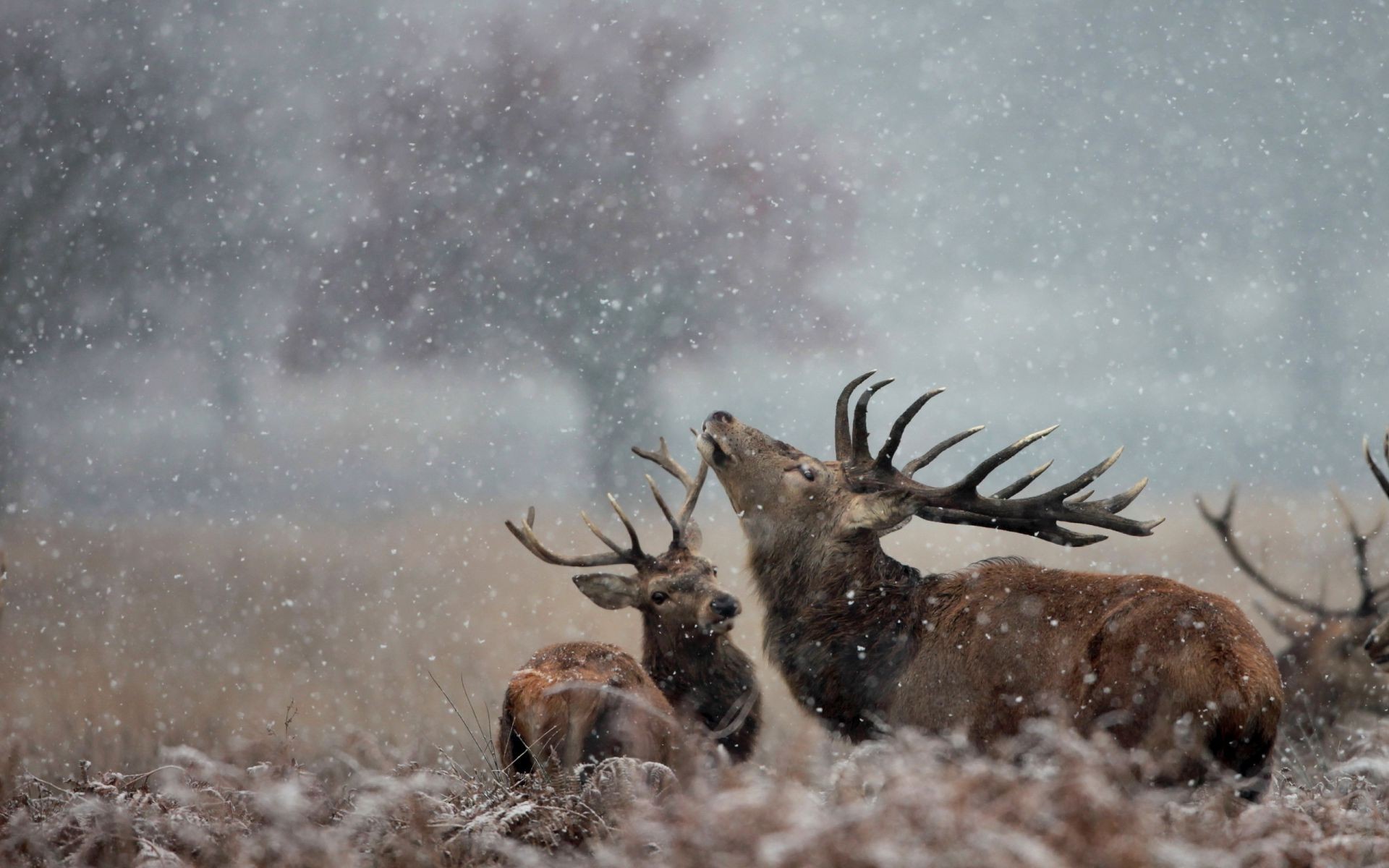 Paisaje de invierno con ciervos con cuernos