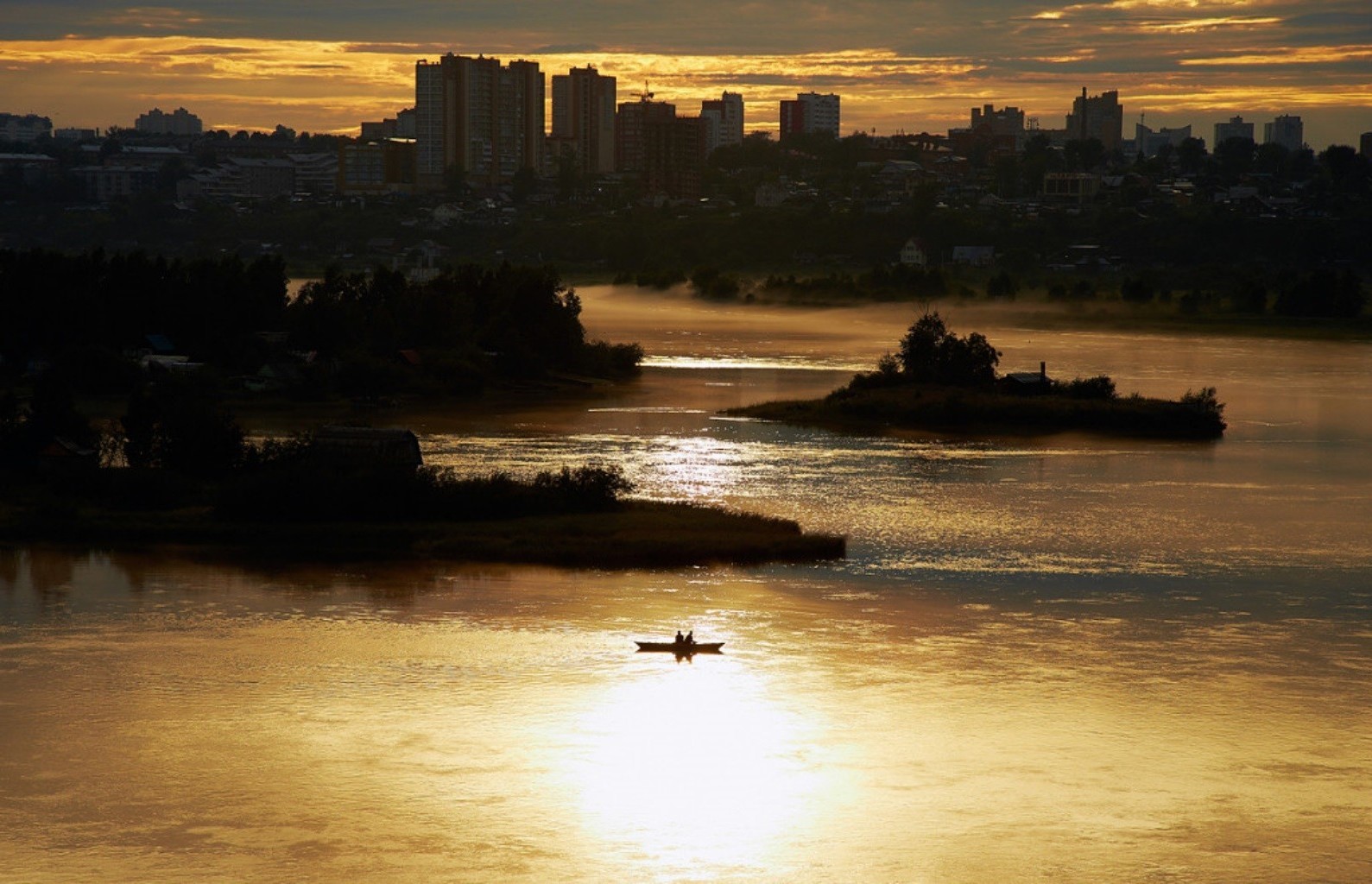 Hermosa cálida noche de la ciudad entre los rascacielos