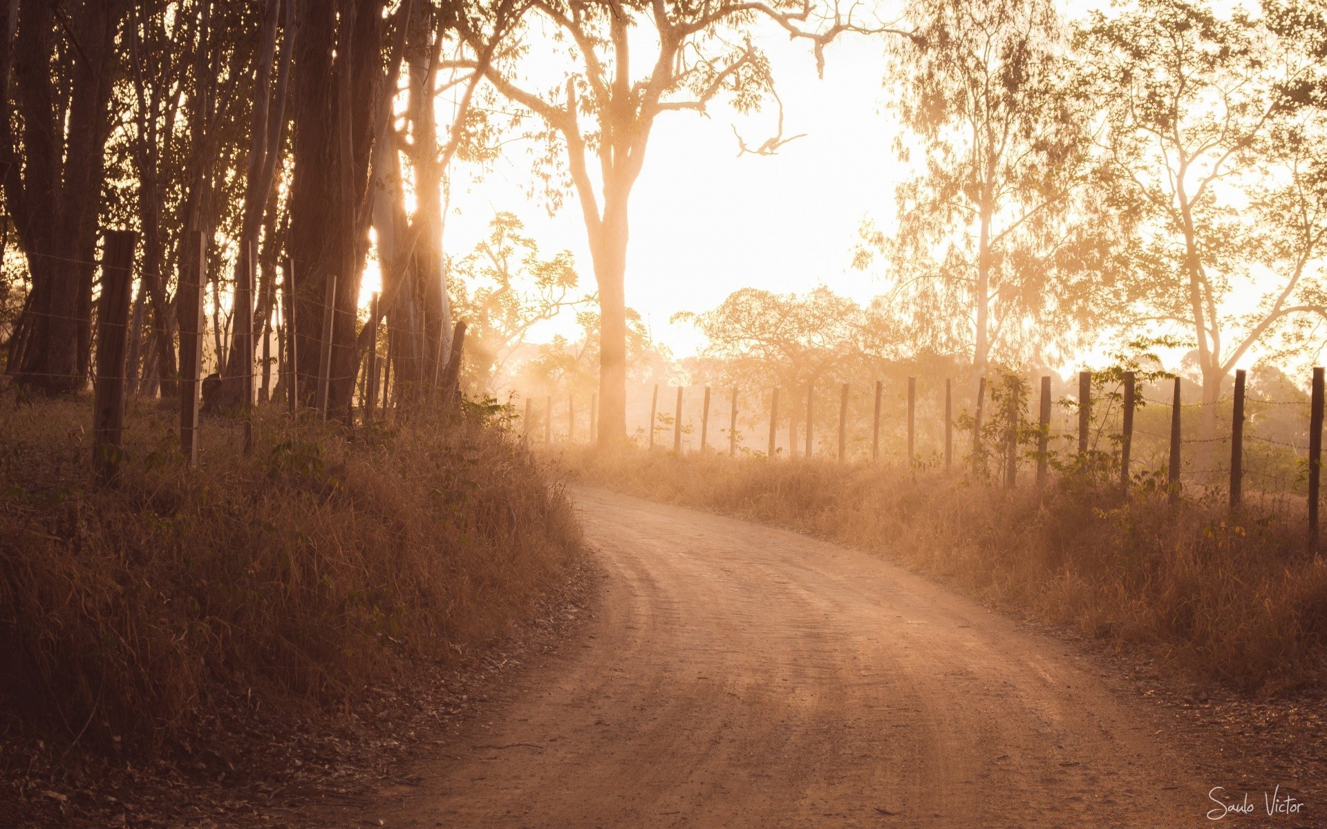 Camino rural brumoso. Sol suave. Camino polvoriento