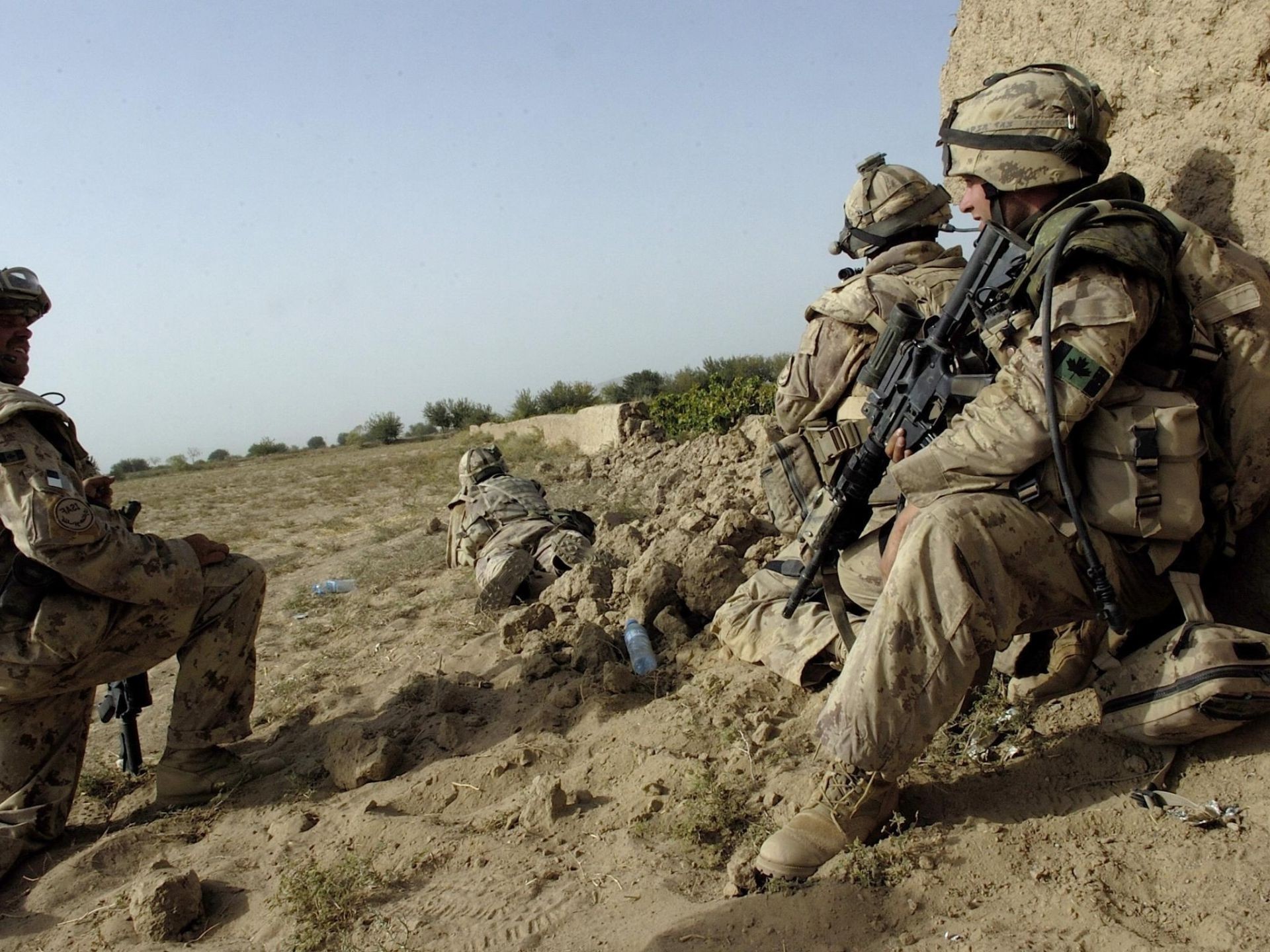 Un soldado uniformado se cuela a través de la hierba alta en un campo