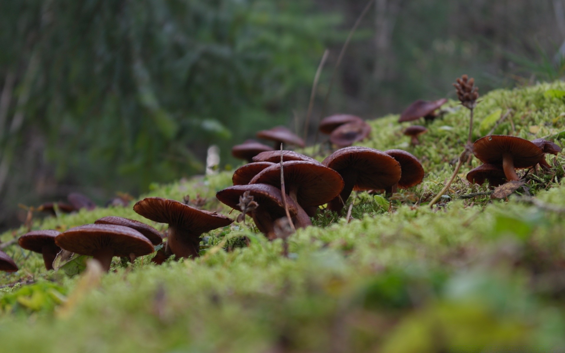 Cesta de mimbre grande con mango lleno de setas en la hierba
