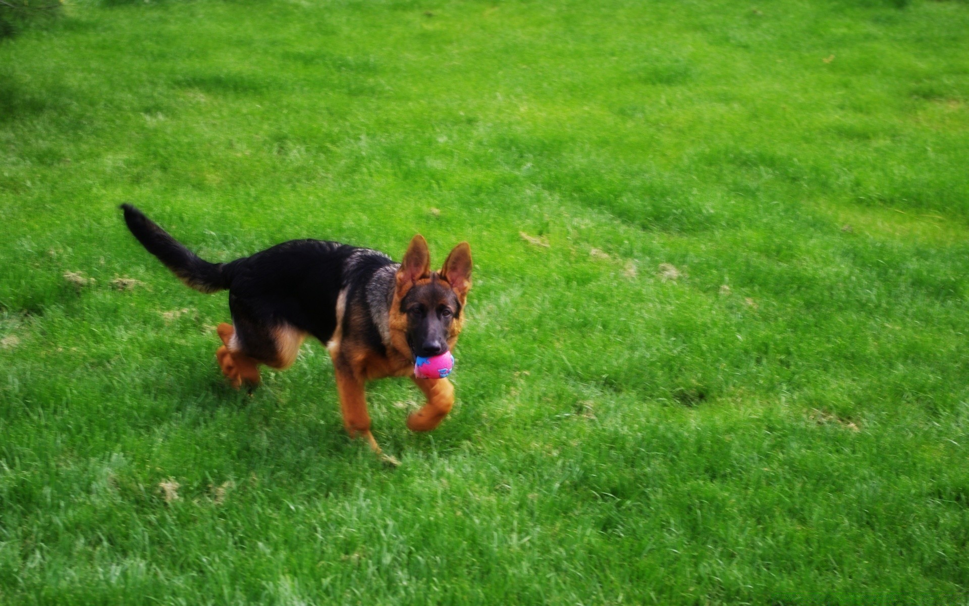Perro jugando con una pelota en el césped