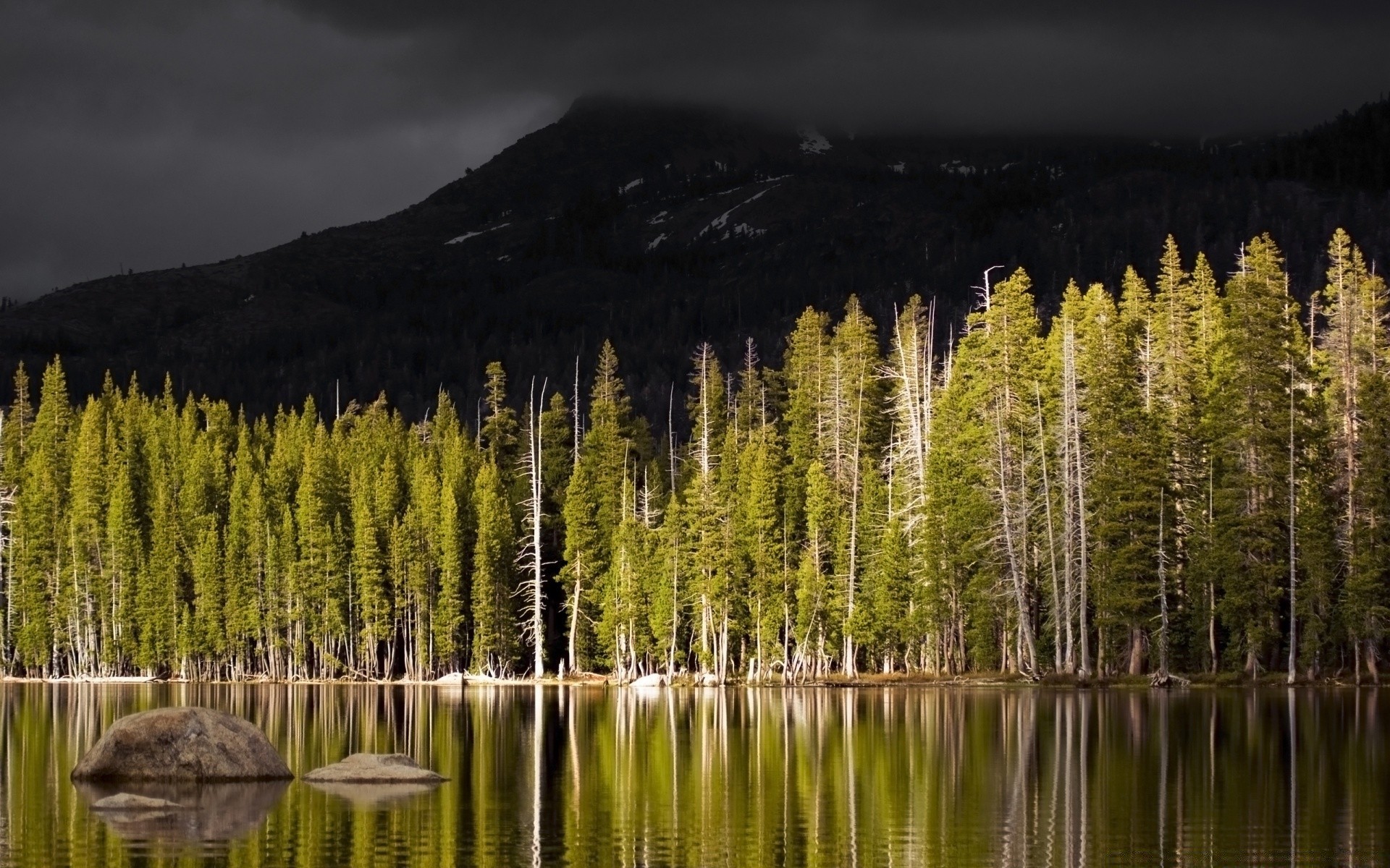 Bosque de coníferas en la orilla del cuerpo de agua
