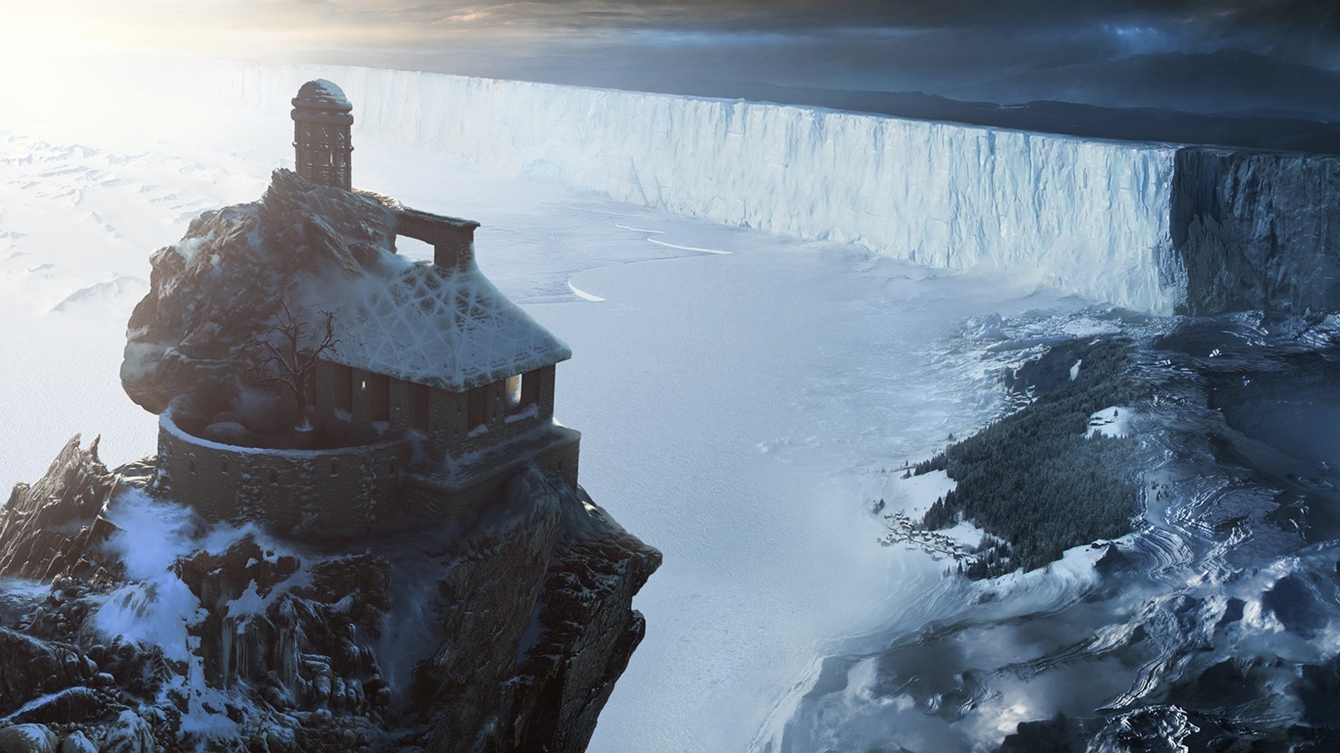 Casa cubierta de nieve en un acantilado rocoso