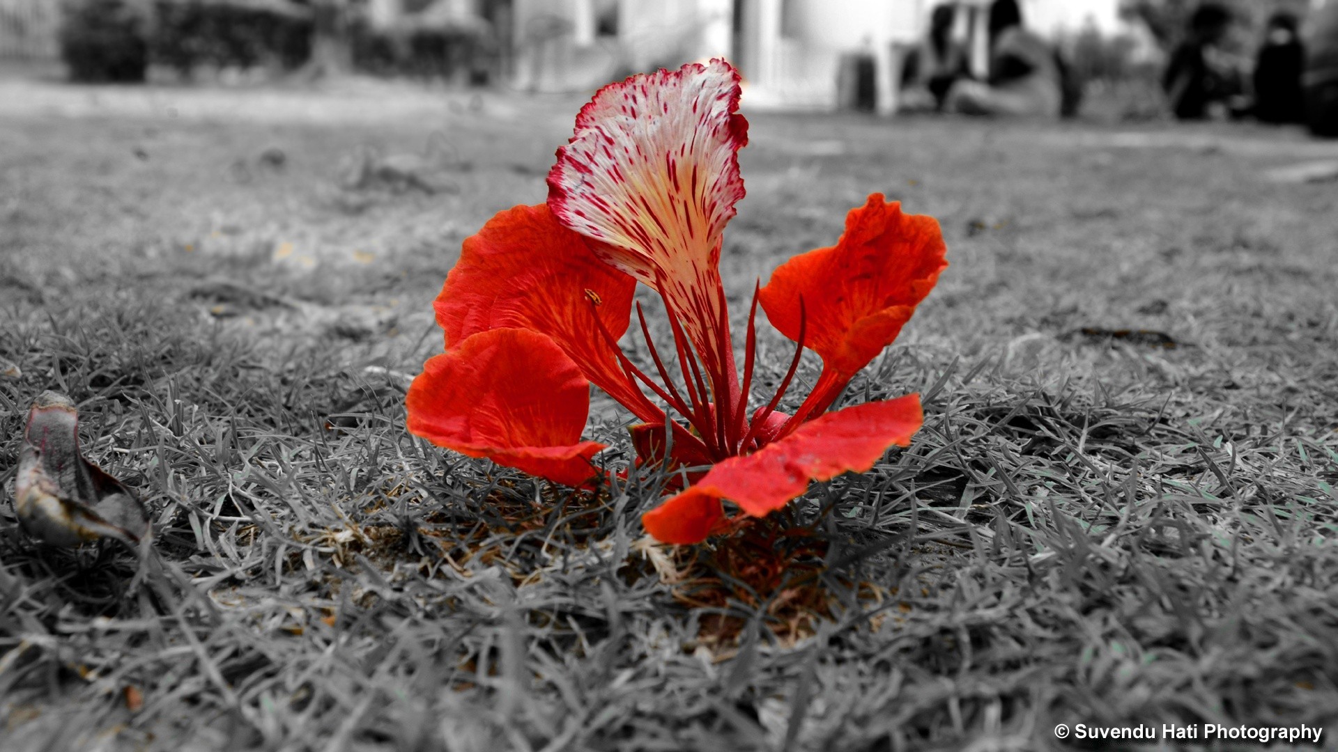 Flor roja sobre efecto blanco y negro. Contraste de la naturaleza