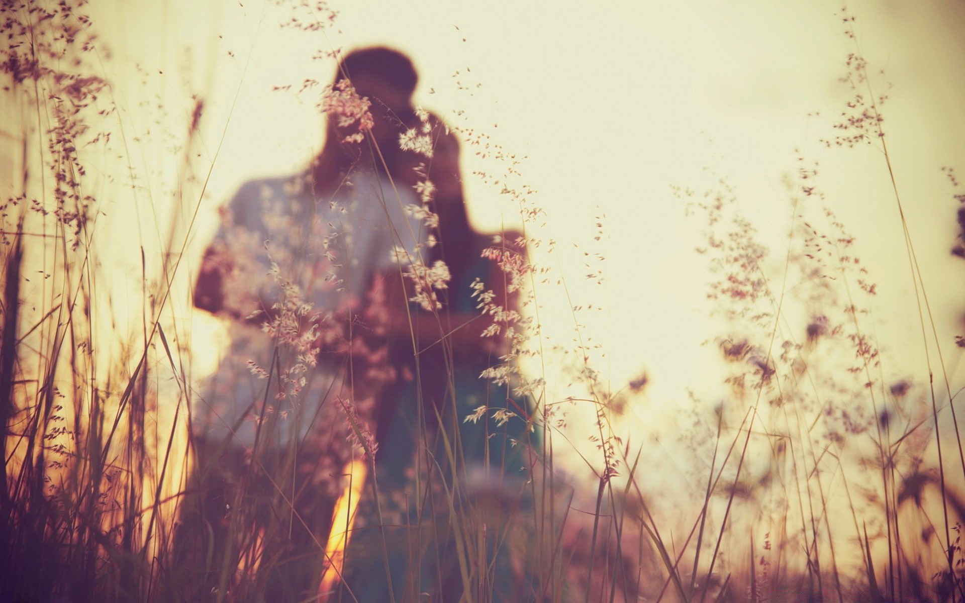 Pareja romántica de pie de espaldas a la cámara en el campo