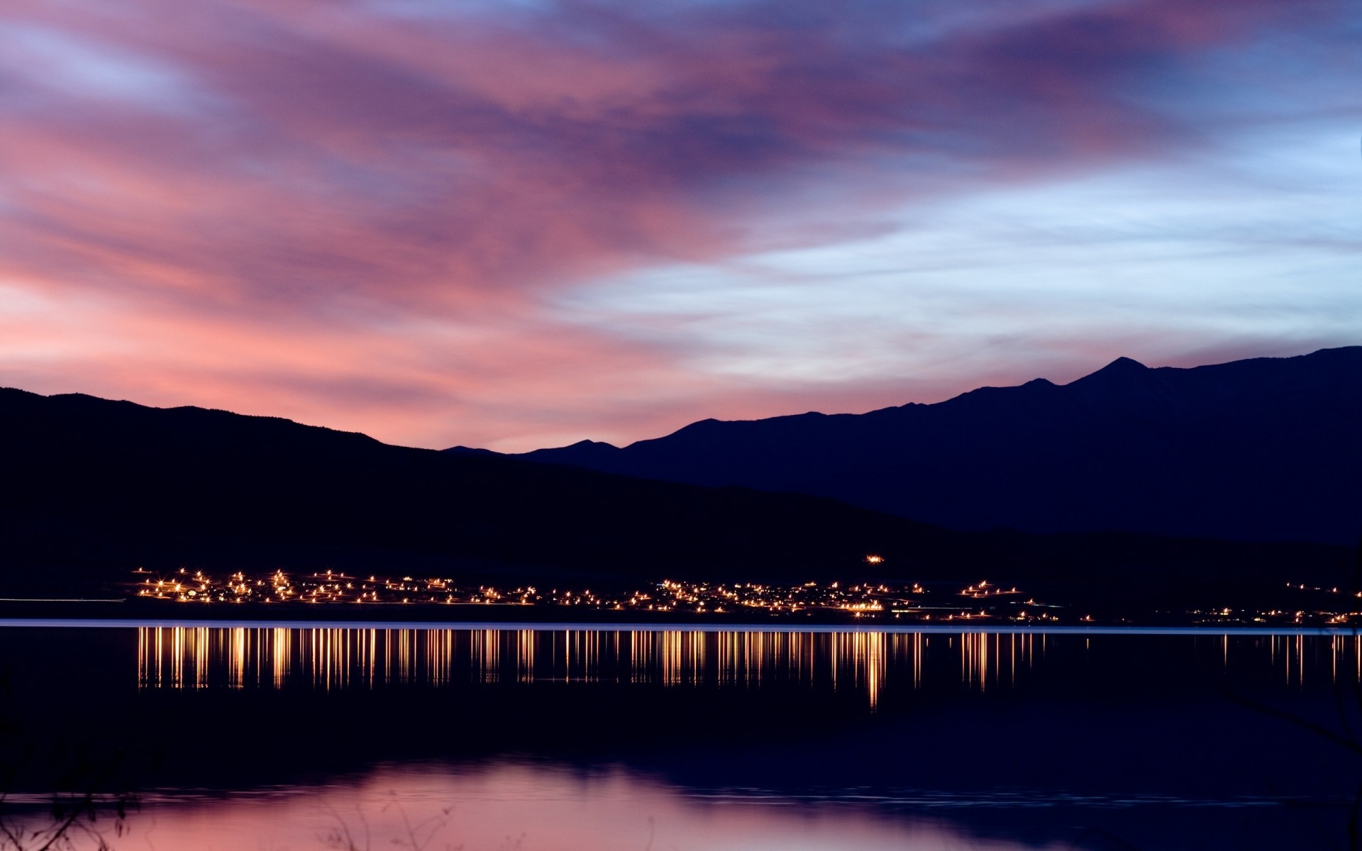 La costa en las luces al atardecer se refleja en las aguas costerasLa costa en las luces al atardecer se refleja en las aguas costeras