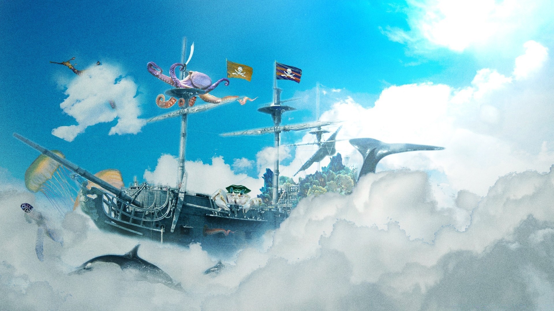 Un barco de ballenas navega por el cielo