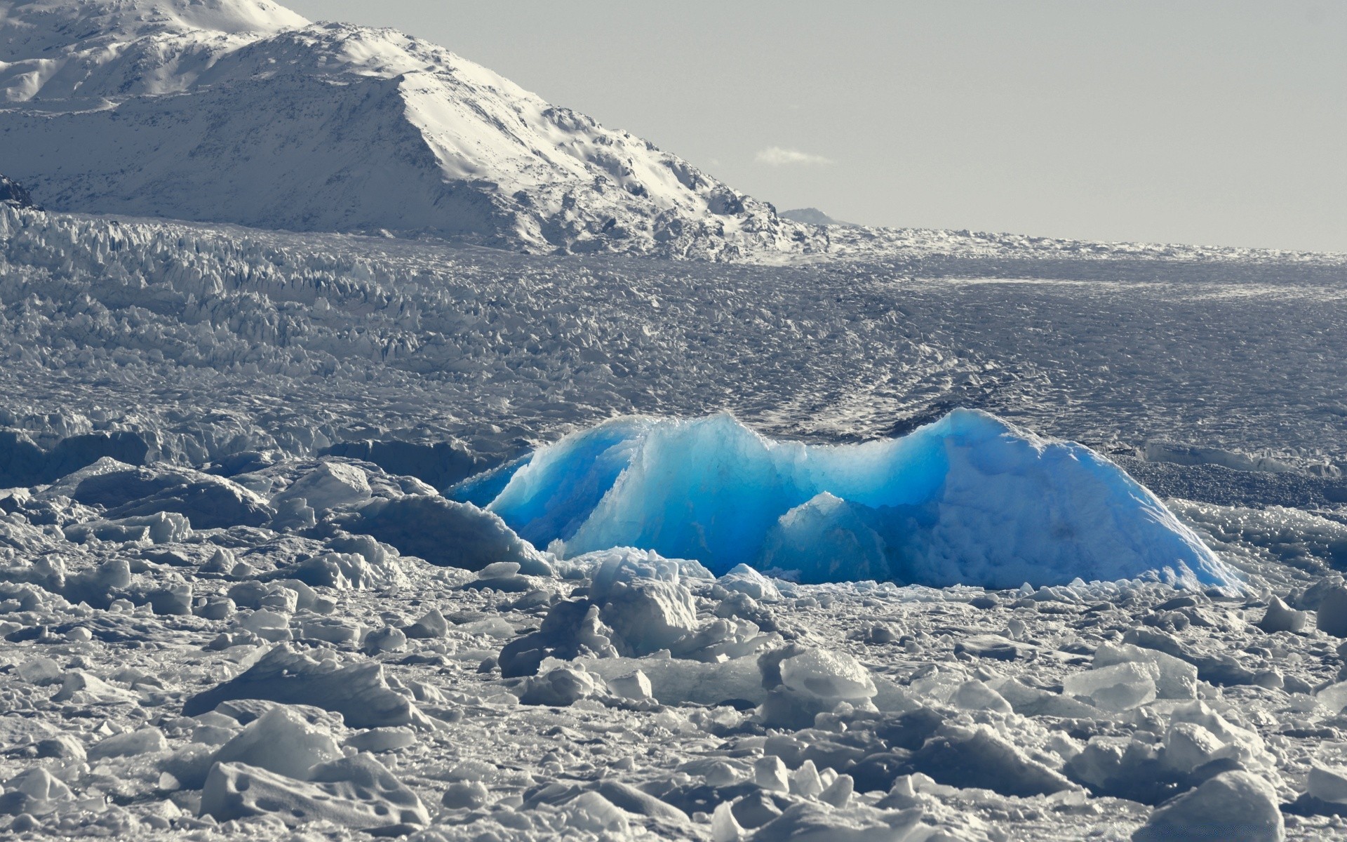 Témpanos de hielo cubiertos de nieve en el fondo de las montañas nevadas
