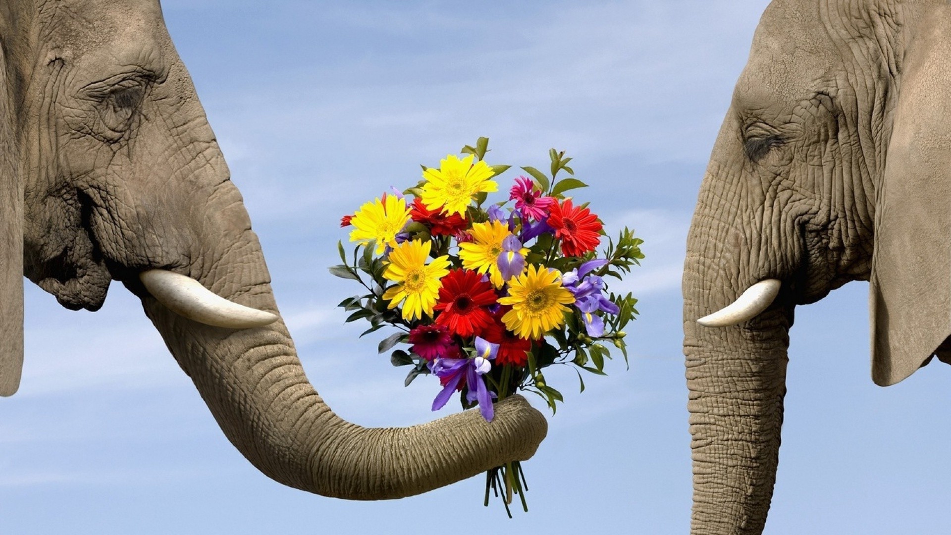 El elefante le da a su amada un ramo de flores