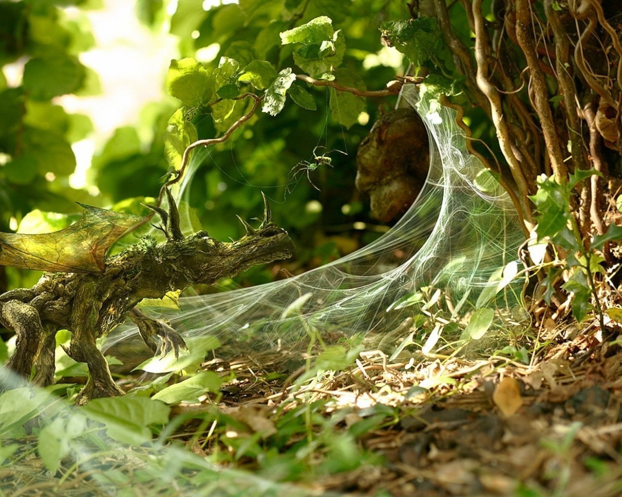 Foto del bosque de verano y la araña