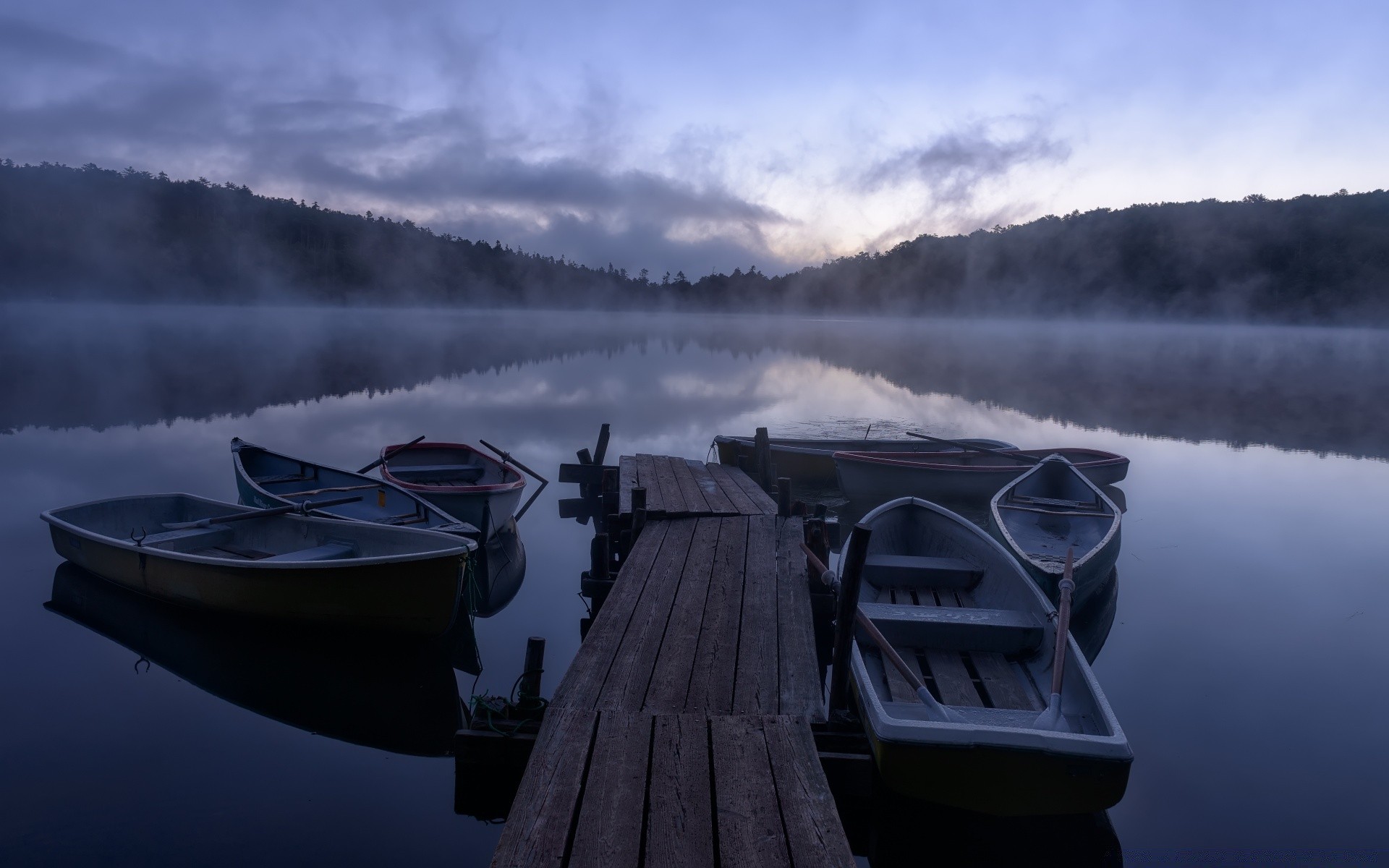 Barcos de madera en la penumbra en el agua