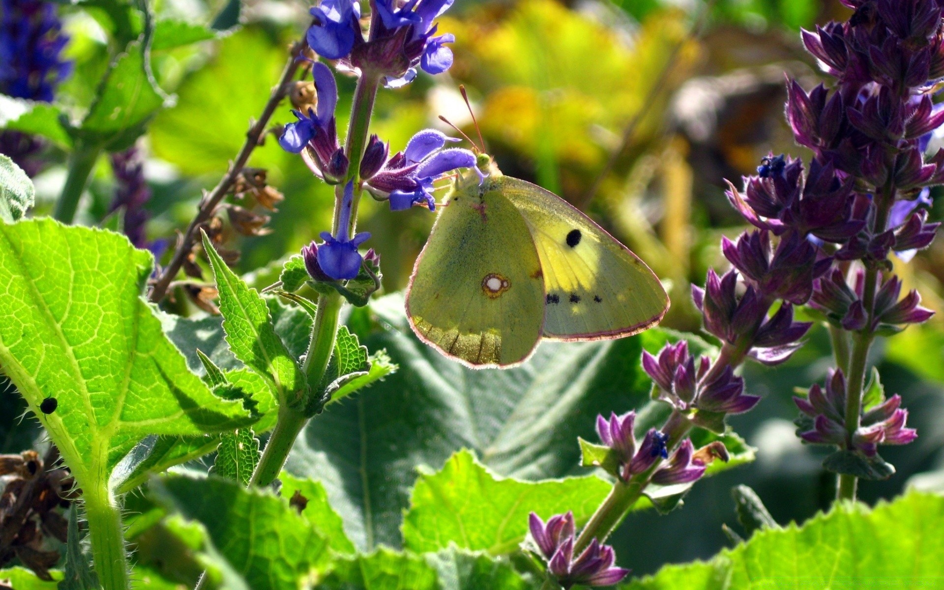 Mariposa verde en el tallo con flores púrpuras