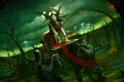 Personajes de fantasía sobre fondo verde