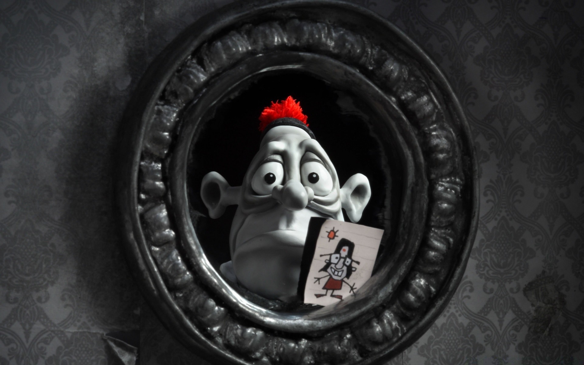 Un personaje triste en un espejo en blanco y negro con el pelo rojo