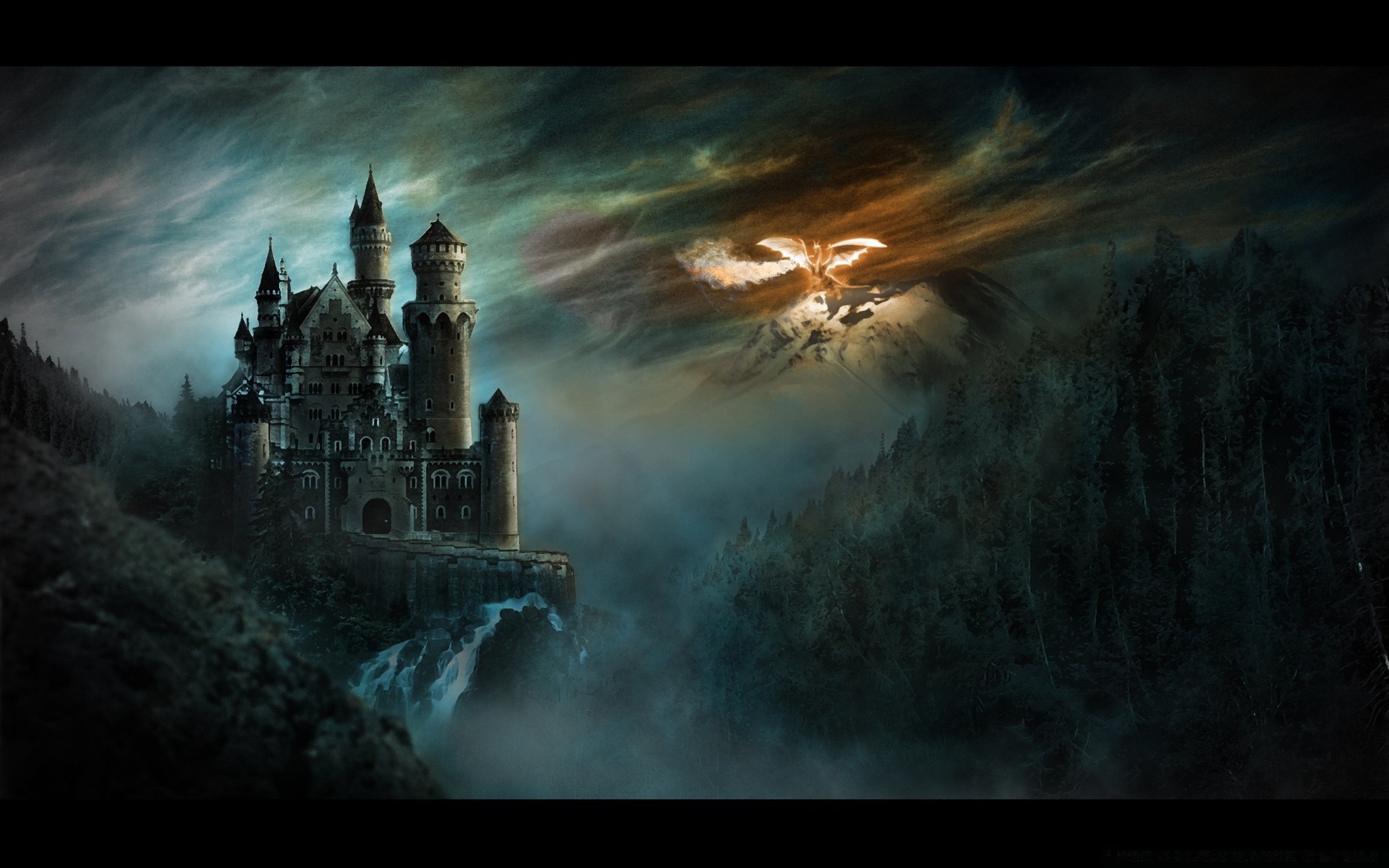 Imagen fantástica: el bosque, las montañas y el planeta sobre ellos
