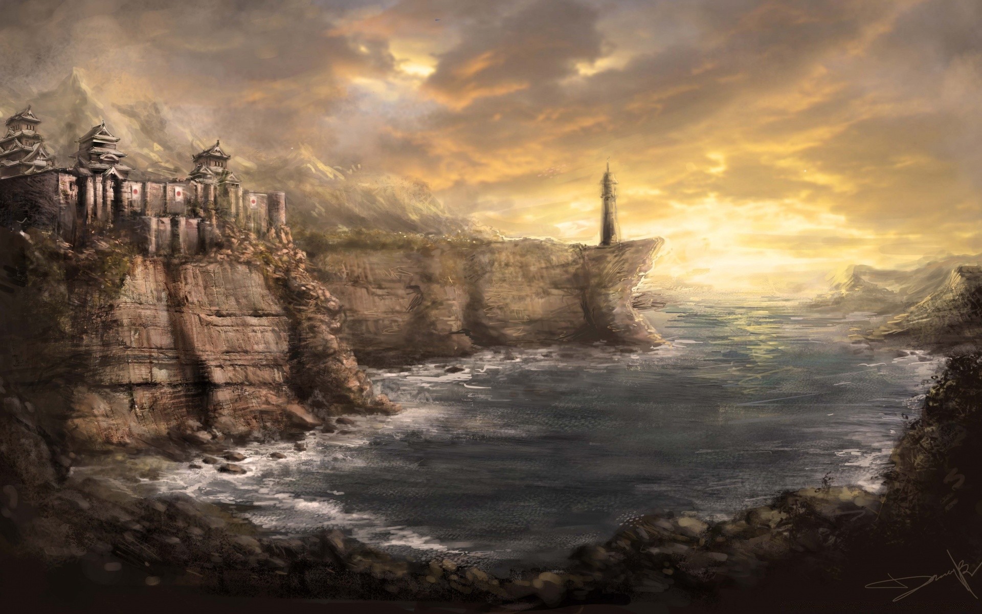 Faro en la costa rocosa escarpada bajo el cielo nocturno en las nubes ah