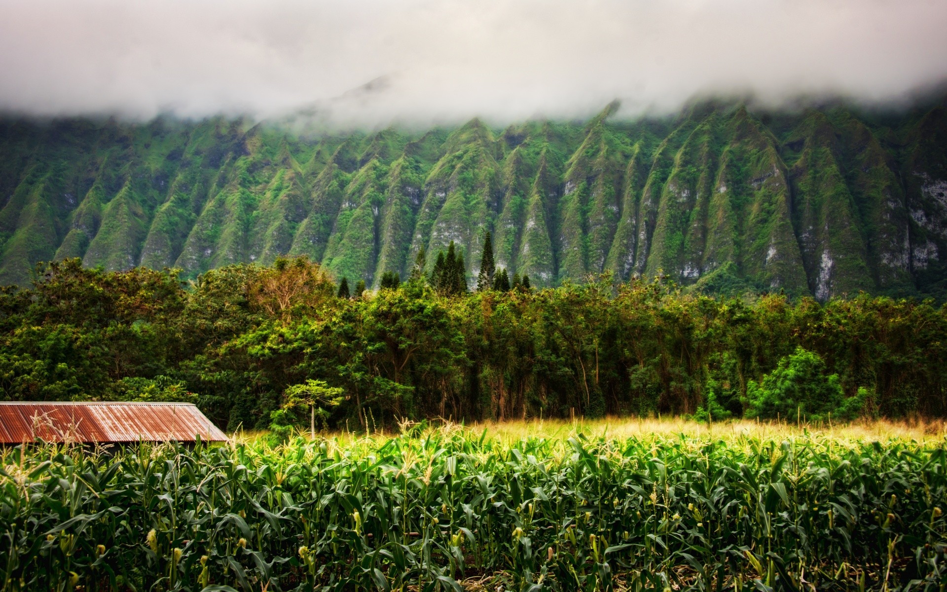 Ramas con hojas verdes sobre el fondo azul del bosqueRamas con hojas verdes sobre el fondo azul del bosque