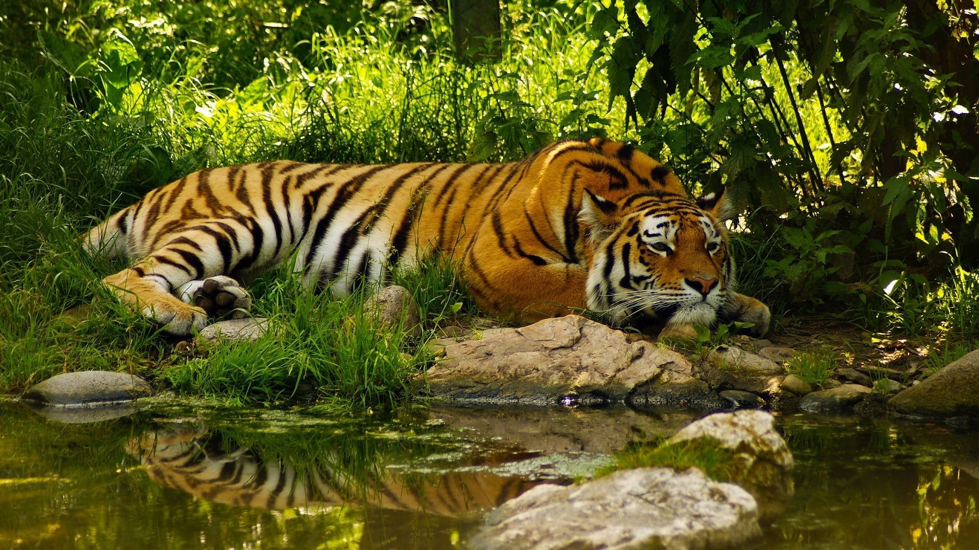 El tigre descansa cerca del estanque
