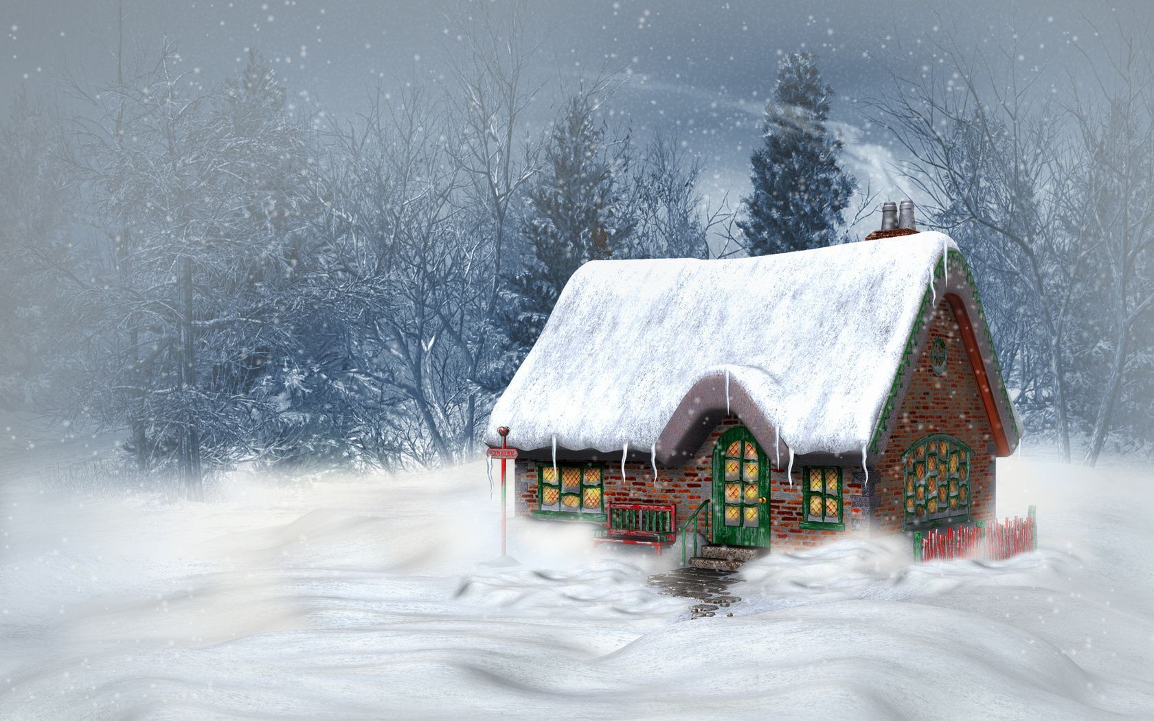 Dibujo de una familia con un perro en el bosque de invierno