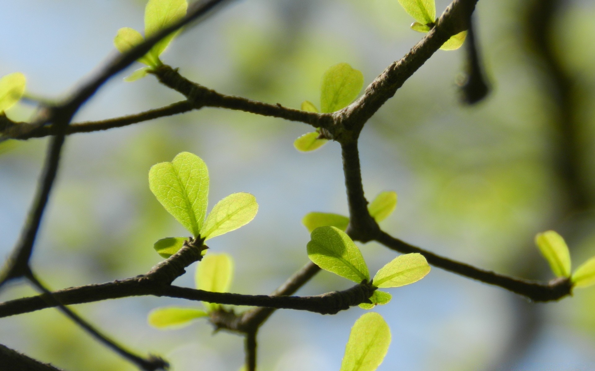 Fotografía macro de hojas en una rama sobre un fondo borroso