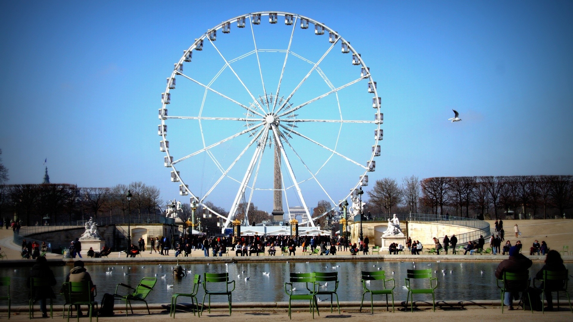 Personas montando en un carrusel con asientos suspendidos contra el cielo azul