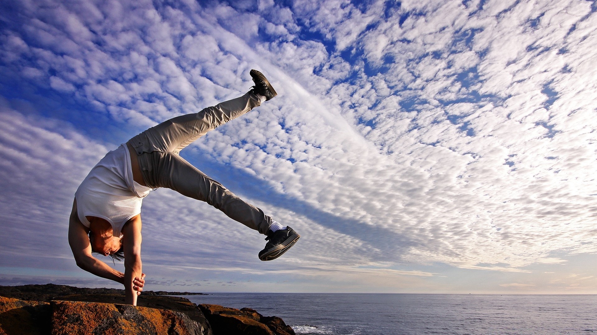 Hombre deportivo entre el cielo blanco como la nieve