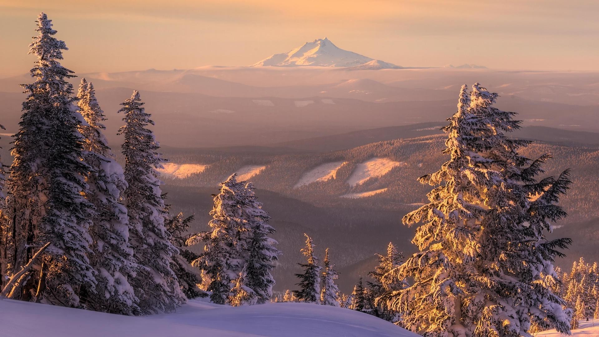 Hermosa puesta de sol en el bosque cubierto de nieve