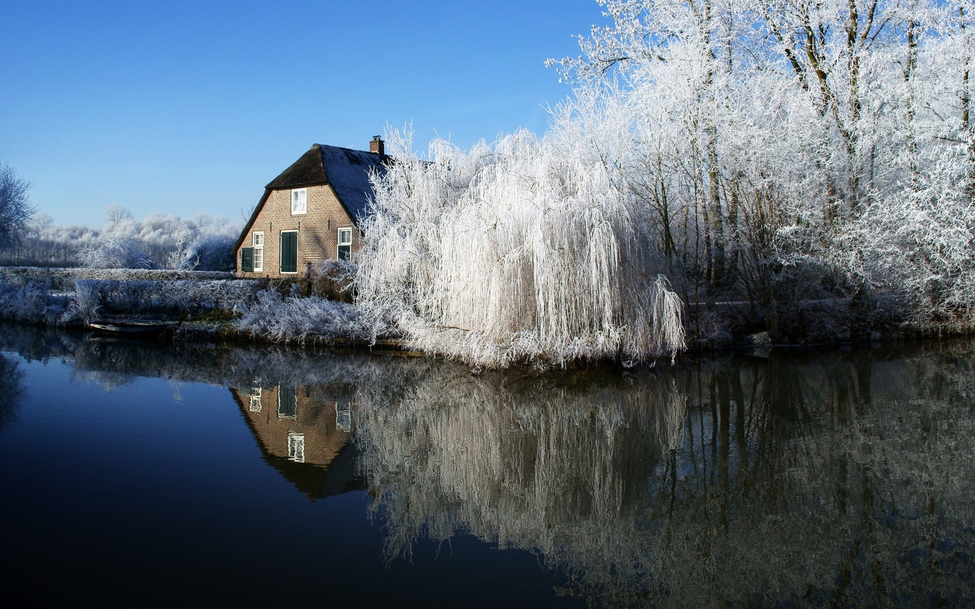 Lago de invierno con árboles nevados