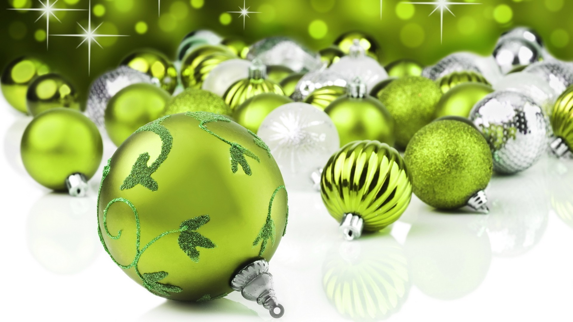 Bolas verdes y plateadas de año nuevo sobre fondo blanco
