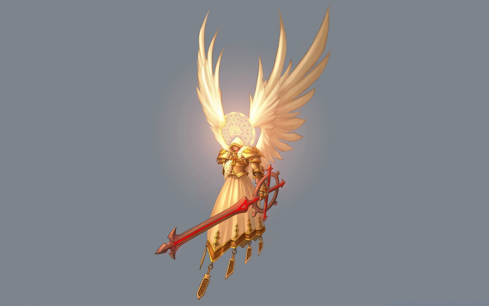 Joven guerrero blanco con una espada en la mano y un trote en el hombroJoven guerrero blanco con una espada en la mano y un trote en el hombro