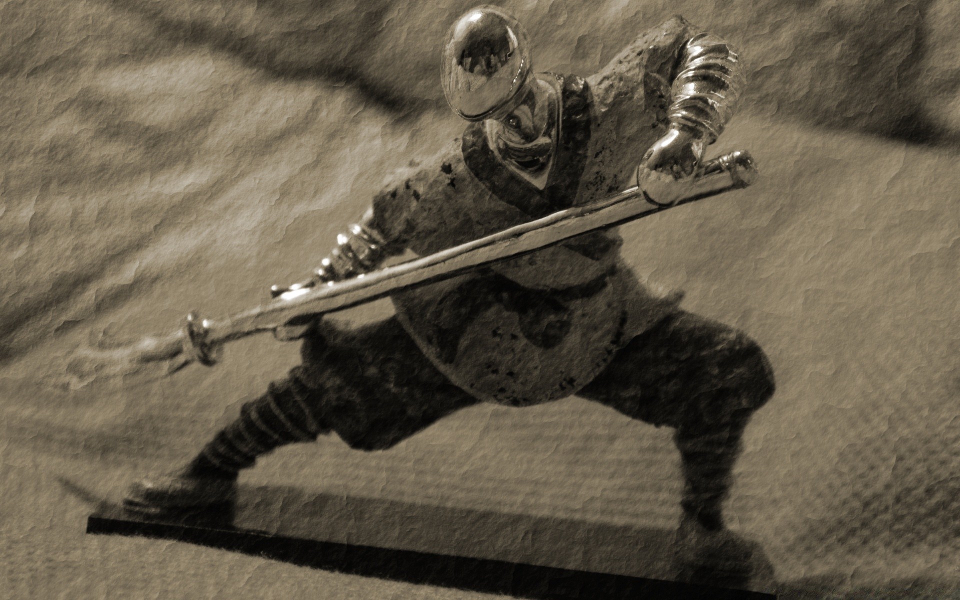 Con placas de hierro, casco y espada, su lucha se desplaza a la chica en la reflexiónCon placas de hierro, casco y espada, su lucha se desplaza a la chica en la reflexión