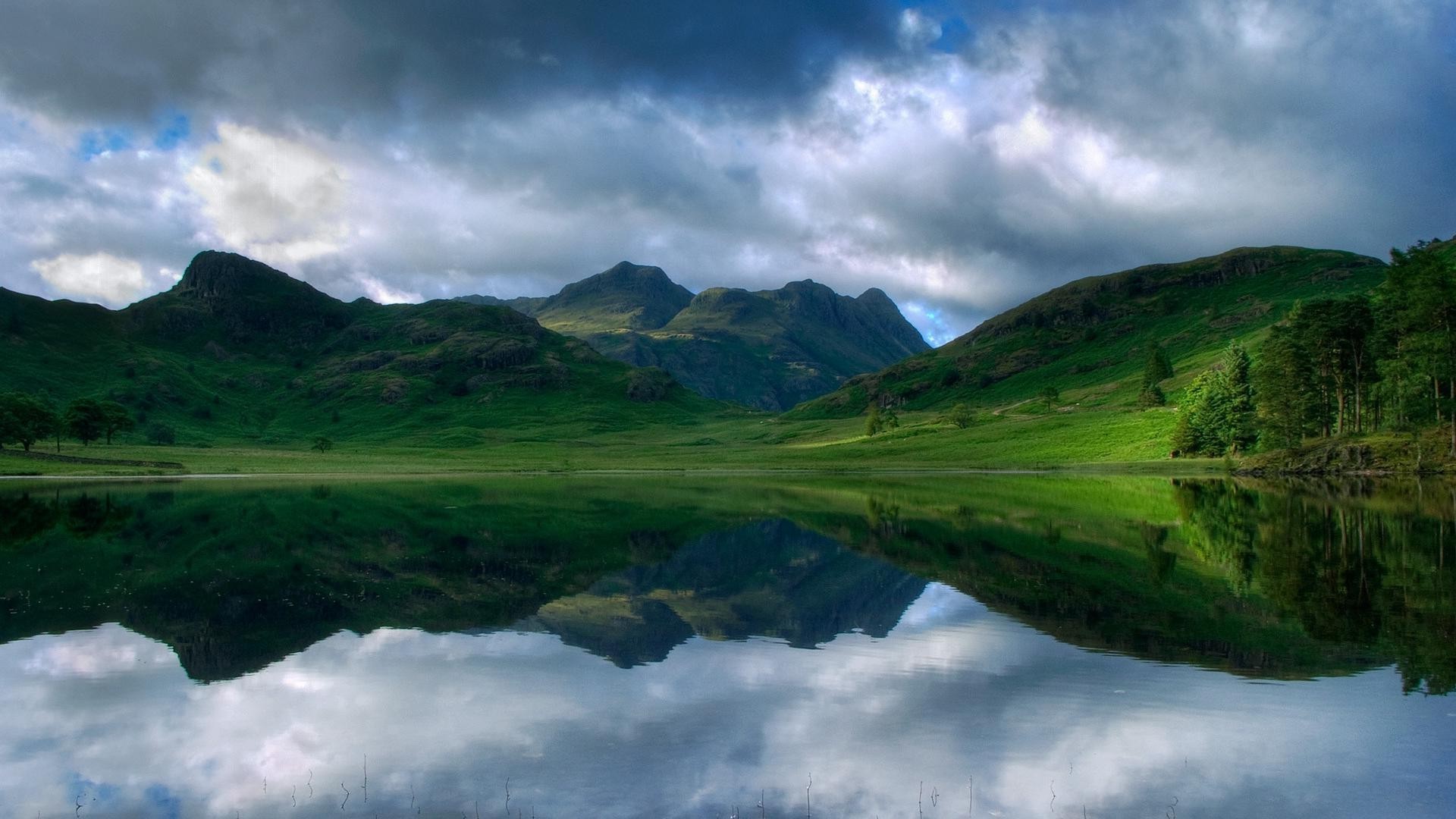 La superficie del espejo del lago refleja el cielo, las cimas de las montañas y los árboles