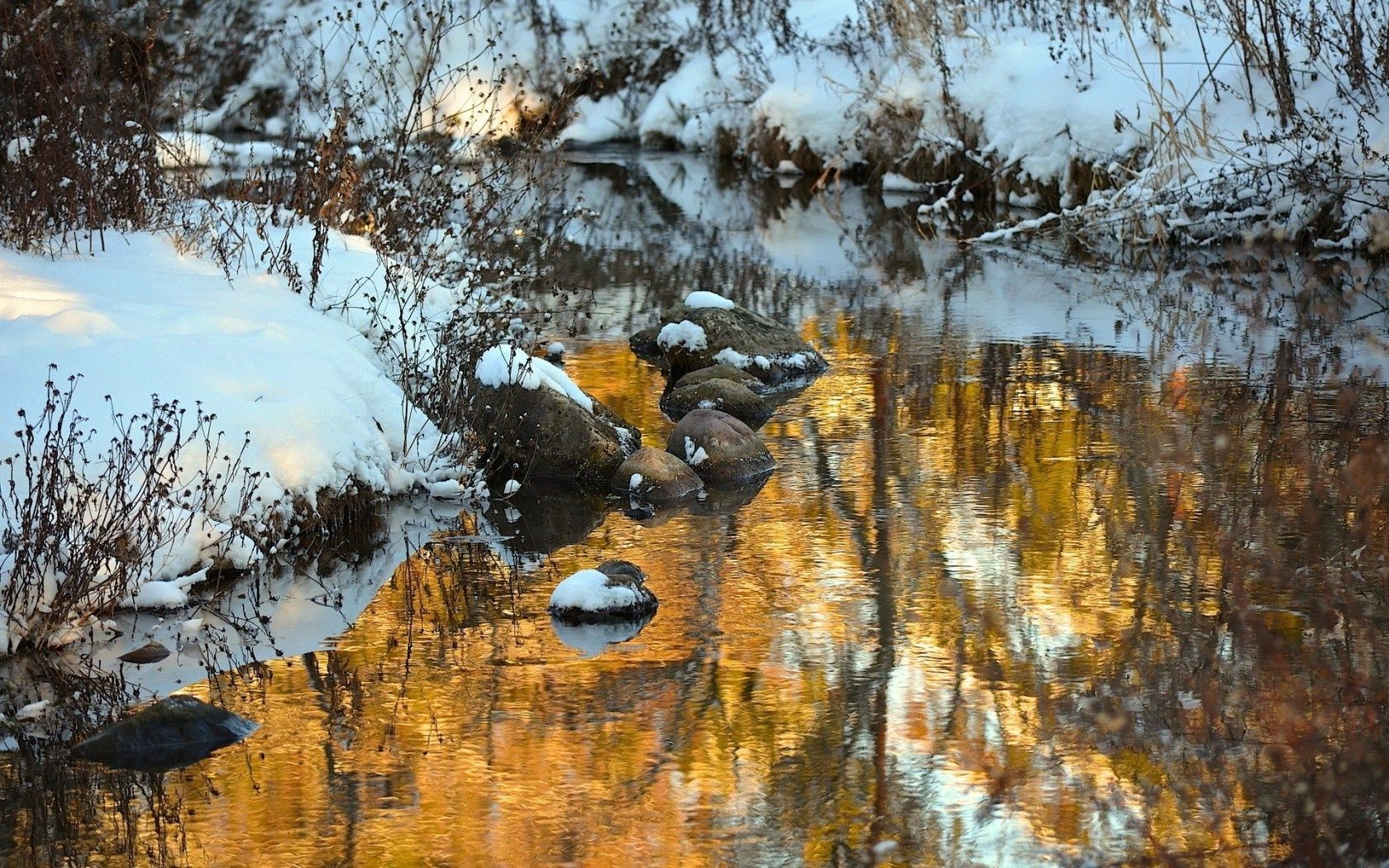 El agua verdosa del río fluye alrededor de los restos redondos del cañón