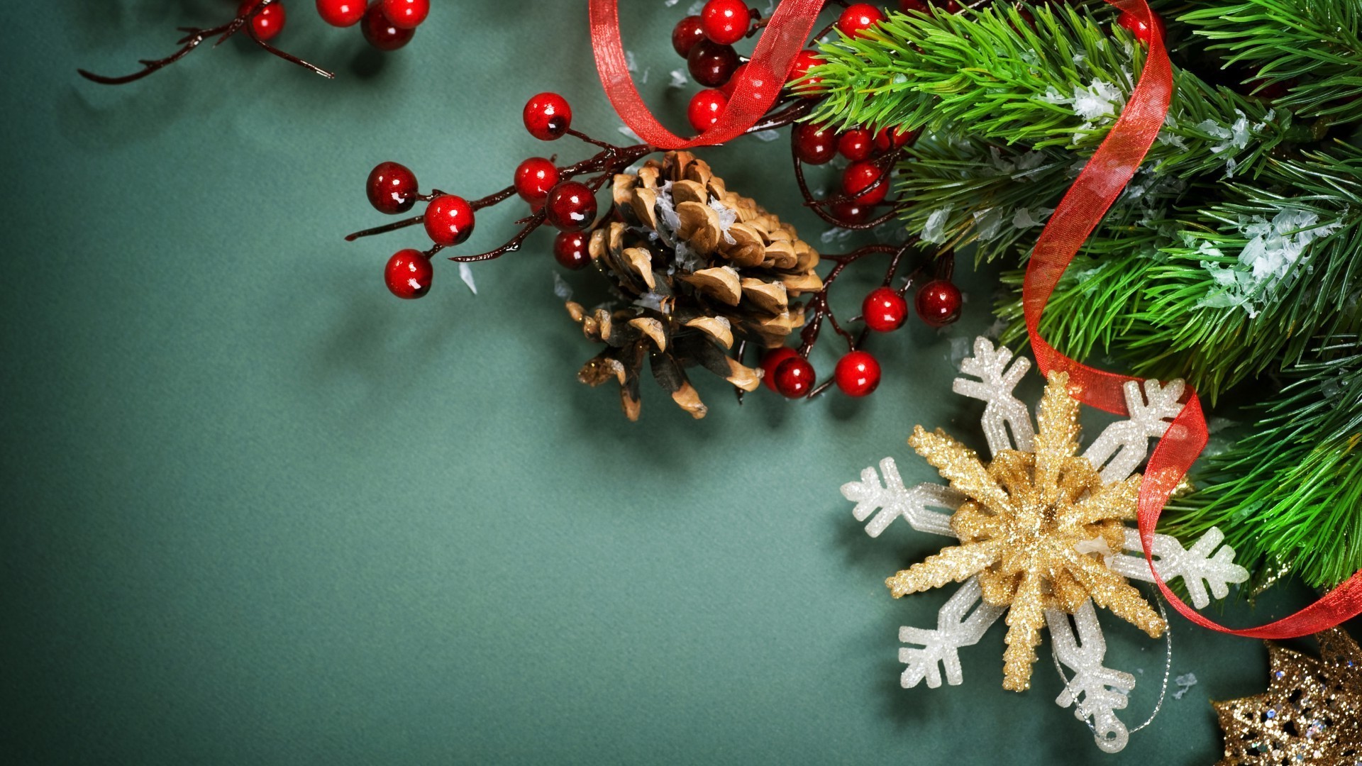 Juguetes de Navidad en ramas de pino con copos de nieve