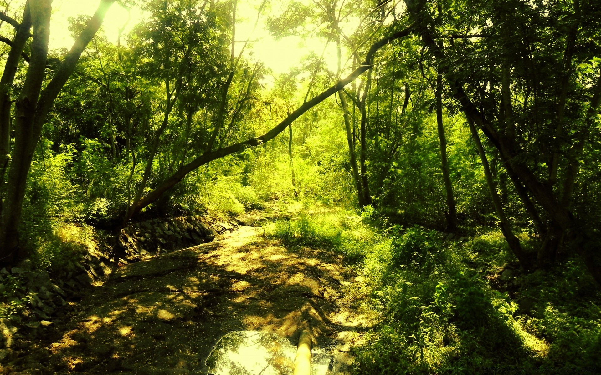 Dos hojas verdes en una ramita sobre un fondo verde borroso