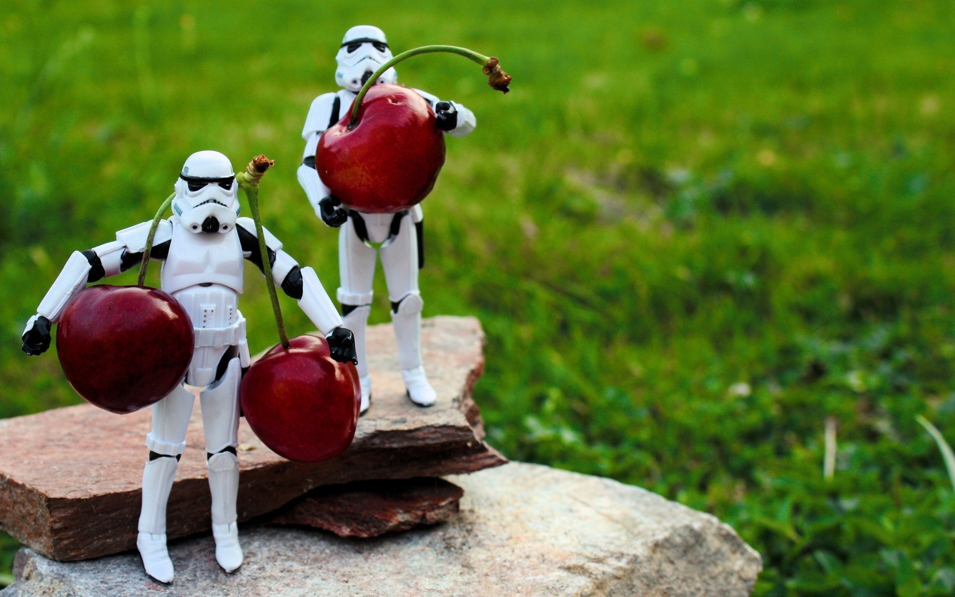 Figuras de robot de la película Star Wars con un regalo en la mano