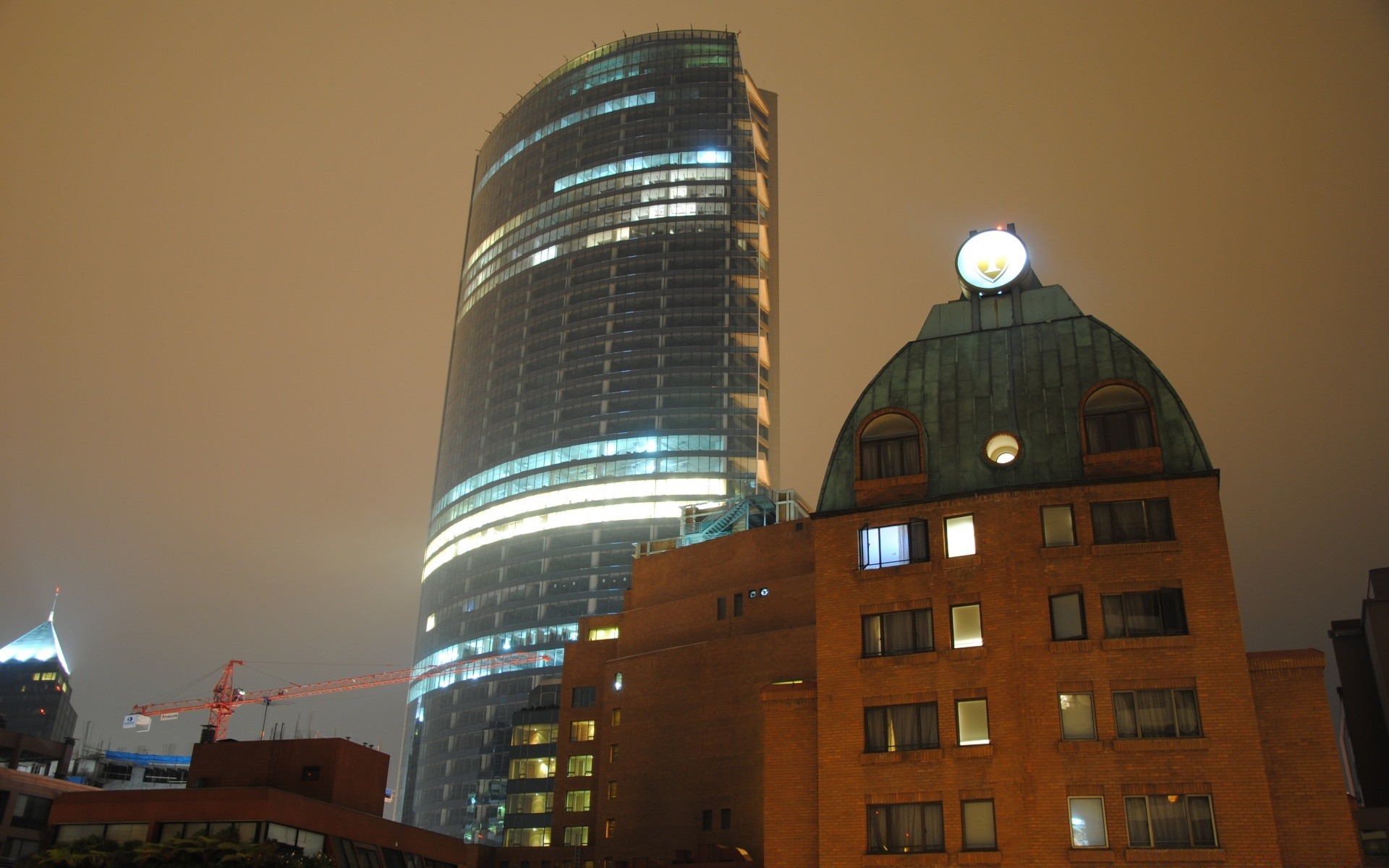 Una ciudad asiática con un rascacielos y un cuerpo de agua