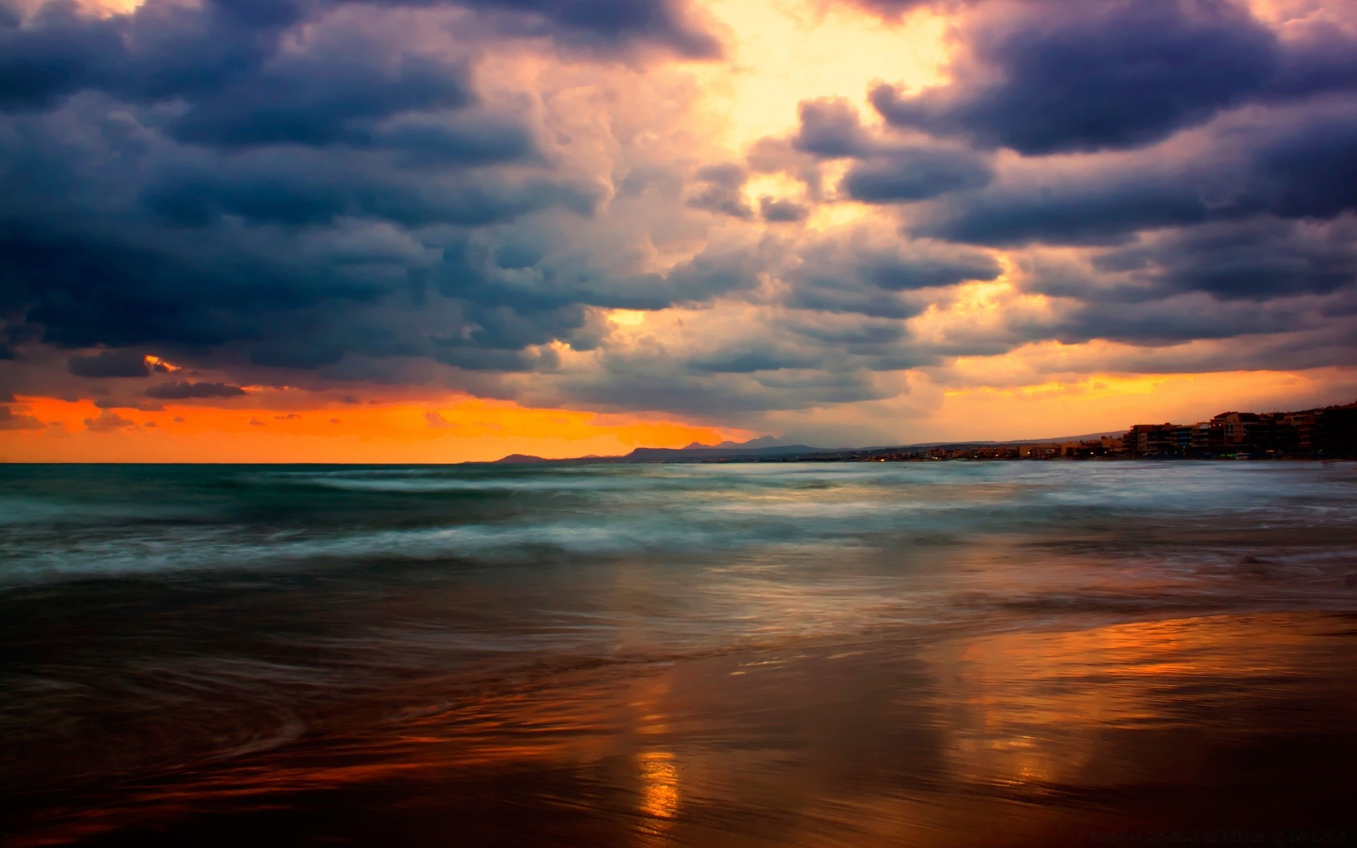 Silueta de casas con palmeras en el cielo eterno reflejado en el agua