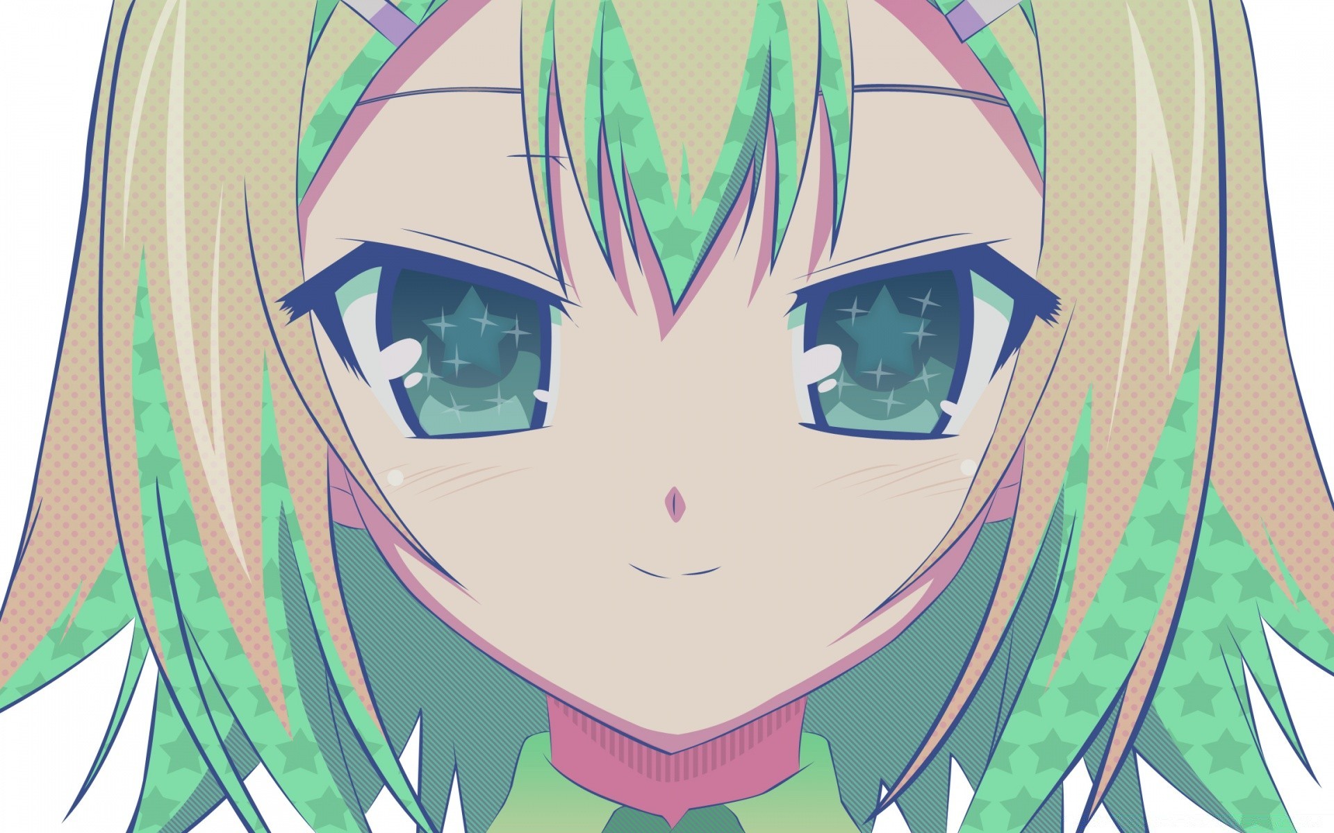 Chica de anime con cabello rubio y verde y ojos verdes sonriendo