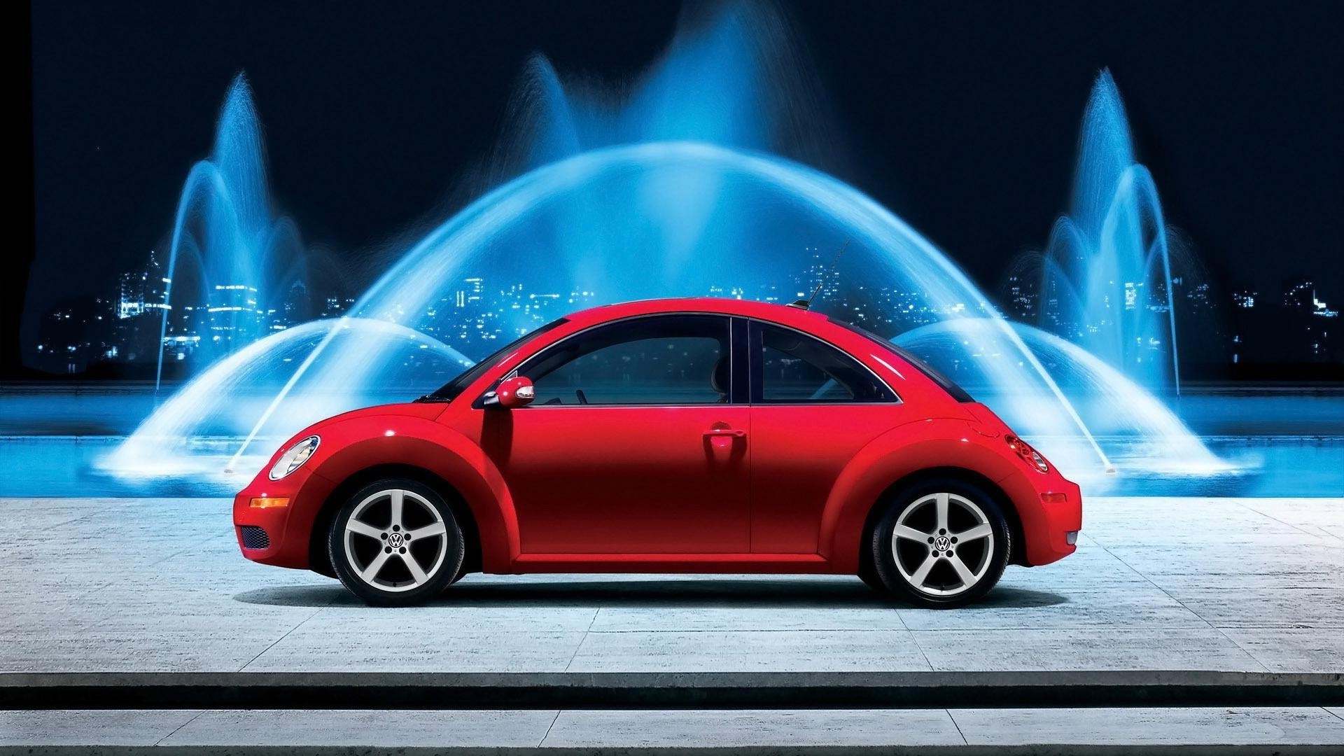 Un coche escarlata brillante y brillante sobre un fondo de hormigón gris