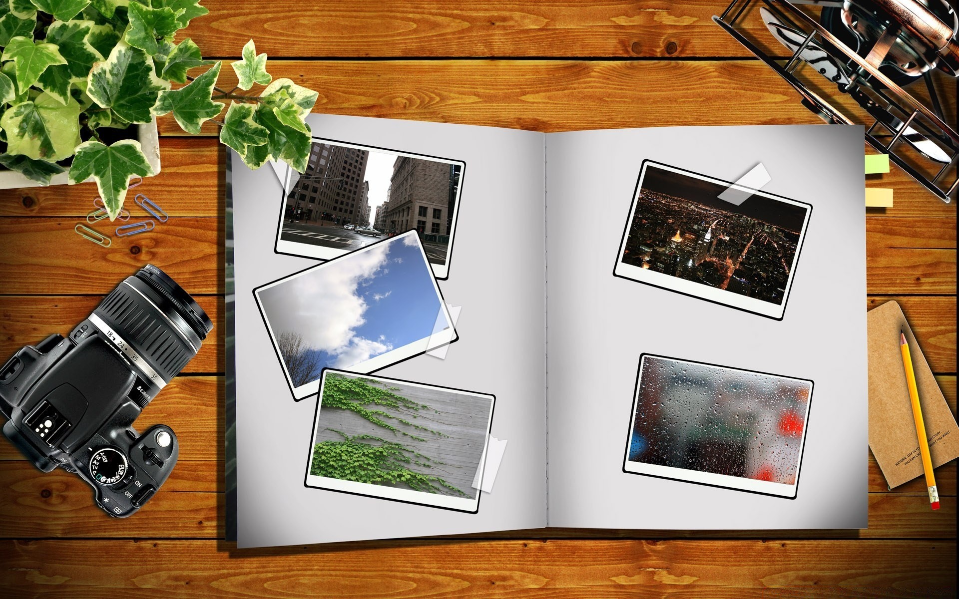Ejemplo de un álbum con una foto sobre un fondo de madera en forma de tablas