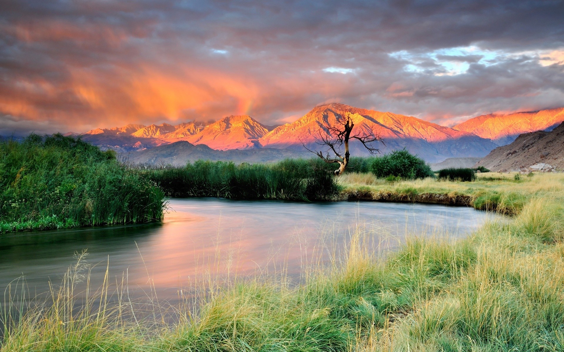 Paisaje con césped en el fondo de la puesta de sol