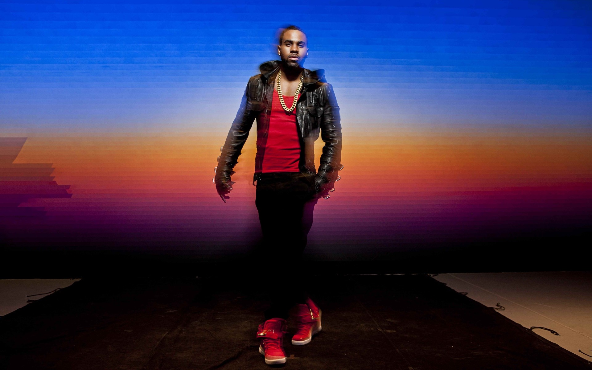 Un músico afroamericano con una camiseta roja, Zapatillas y una chaqueta sobre un fondo de arco iris