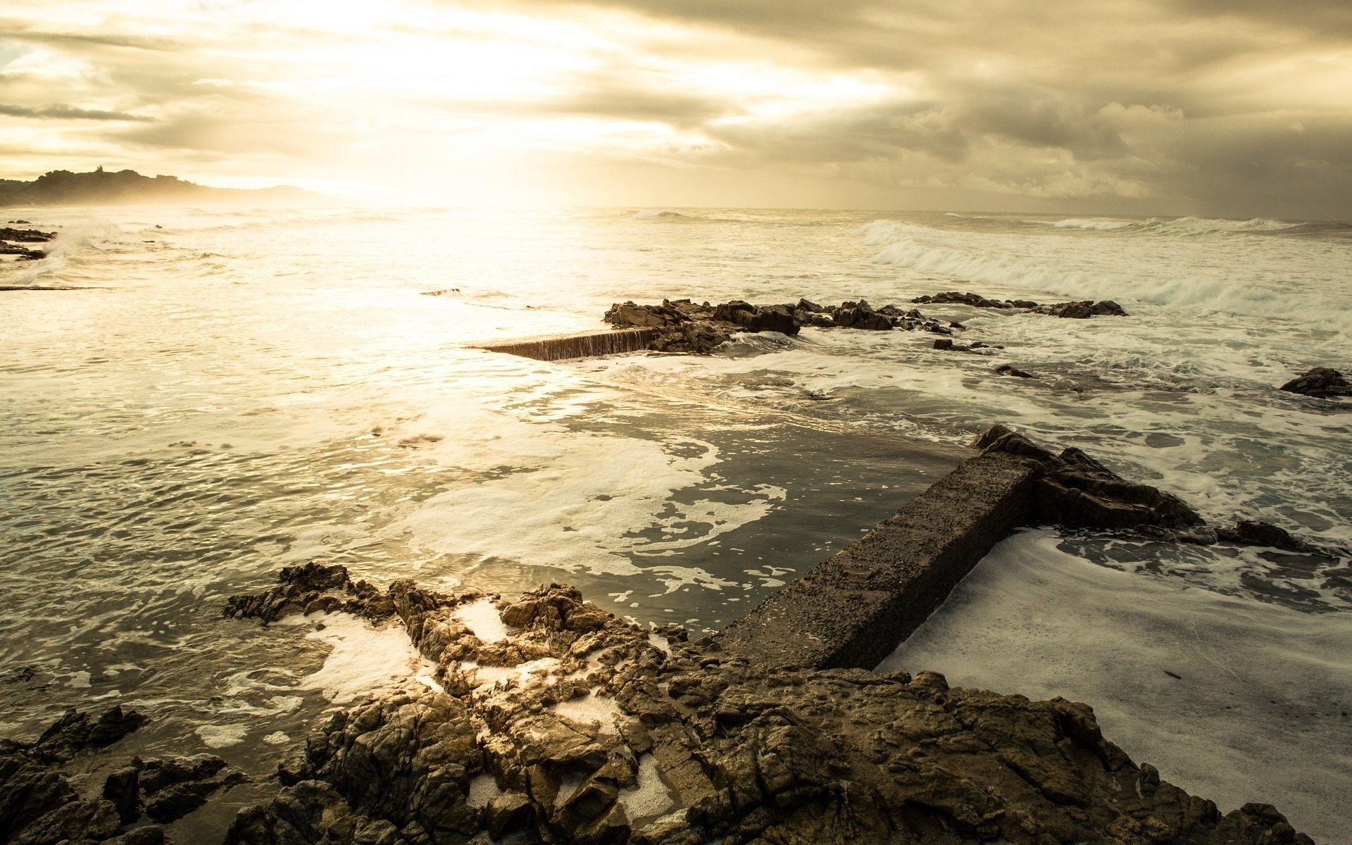 Imagen de las olas con los arrecifes en el fondo de la puesta de sol