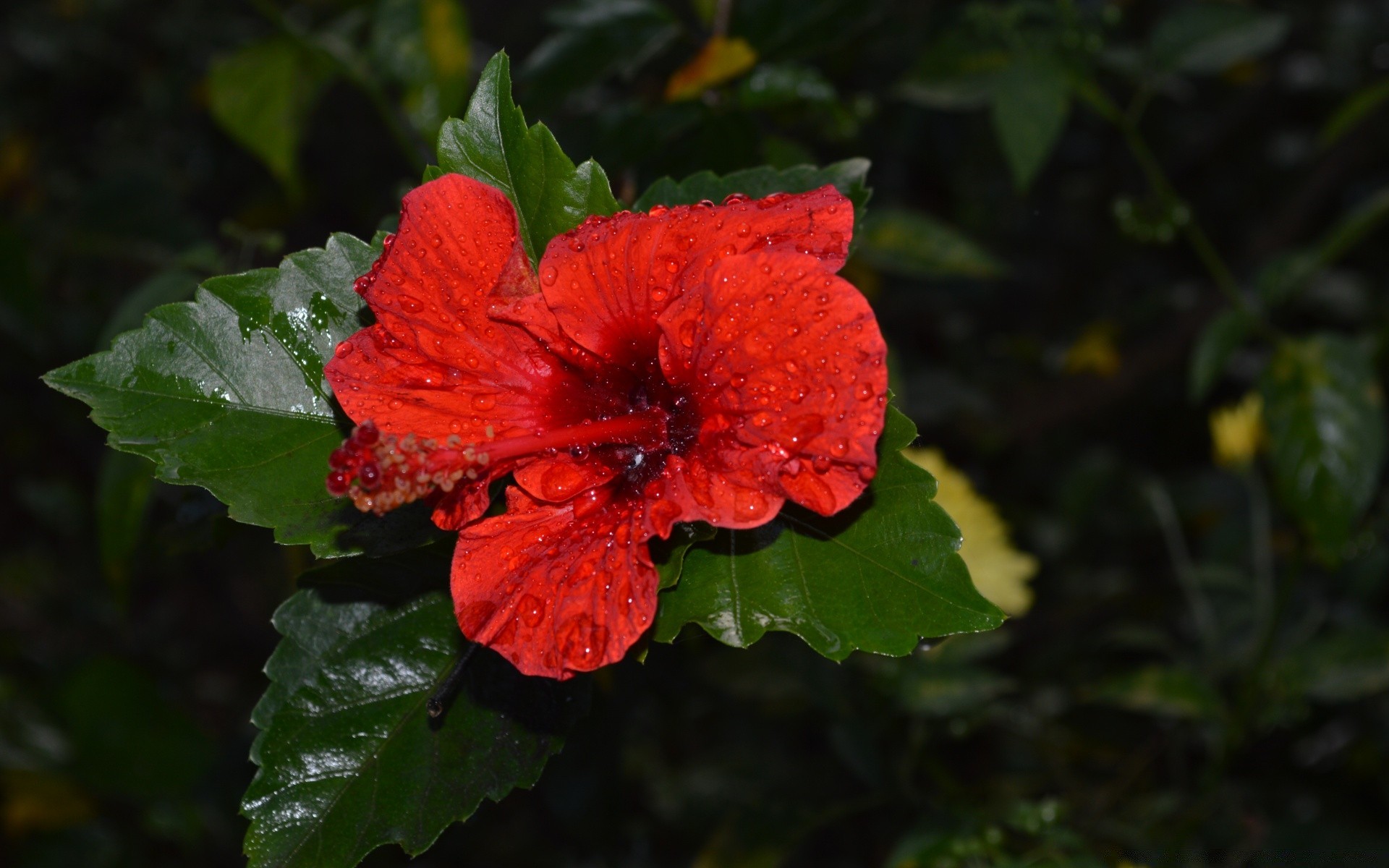 Flor roja con hojas mojadas sobre un fondo oscuro