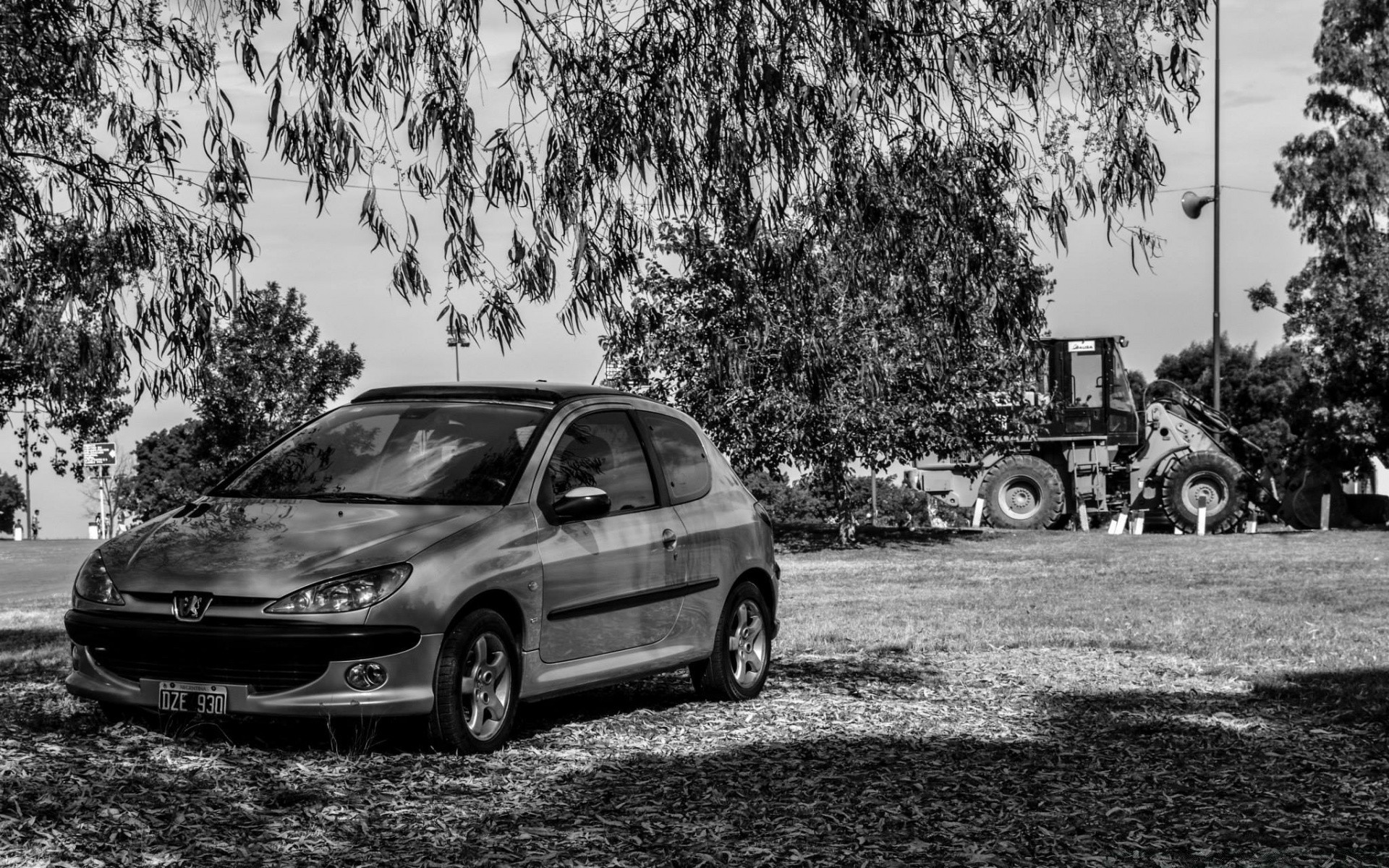 Foto en blanco y negro de un coche bajo la sombra de un enorme árbolFoto en blanco y negro de un coche bajo la sombra de un enorme árbol