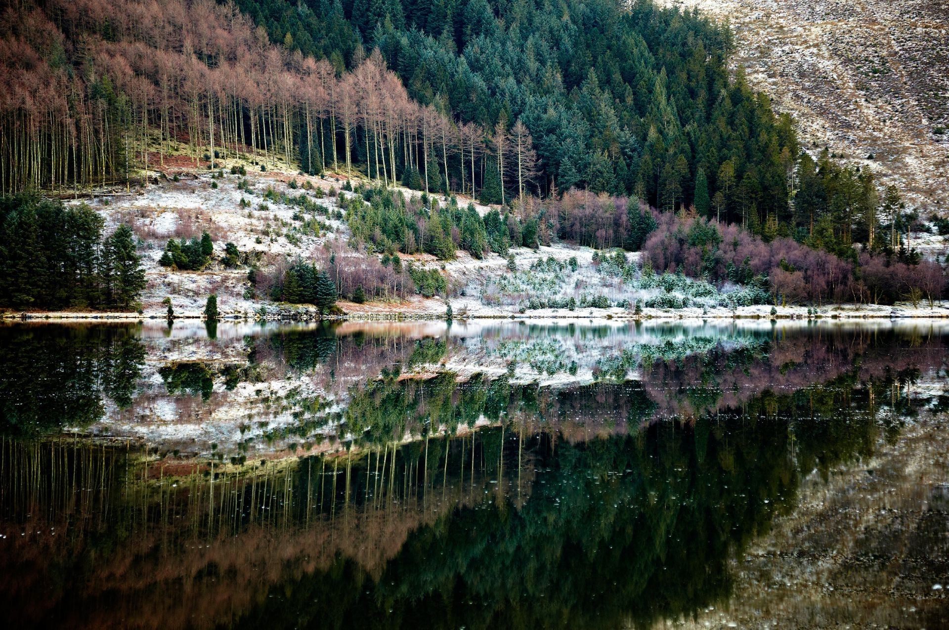 Reflejo del bosque en agua clara