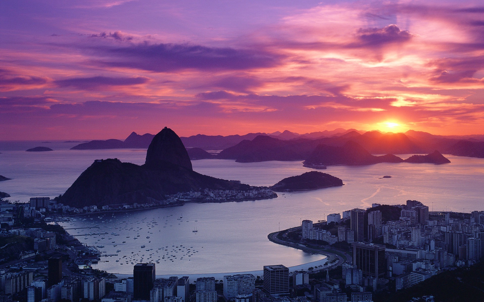 La puesta de sol se refleja en el cuerpo de agua de la ciudad